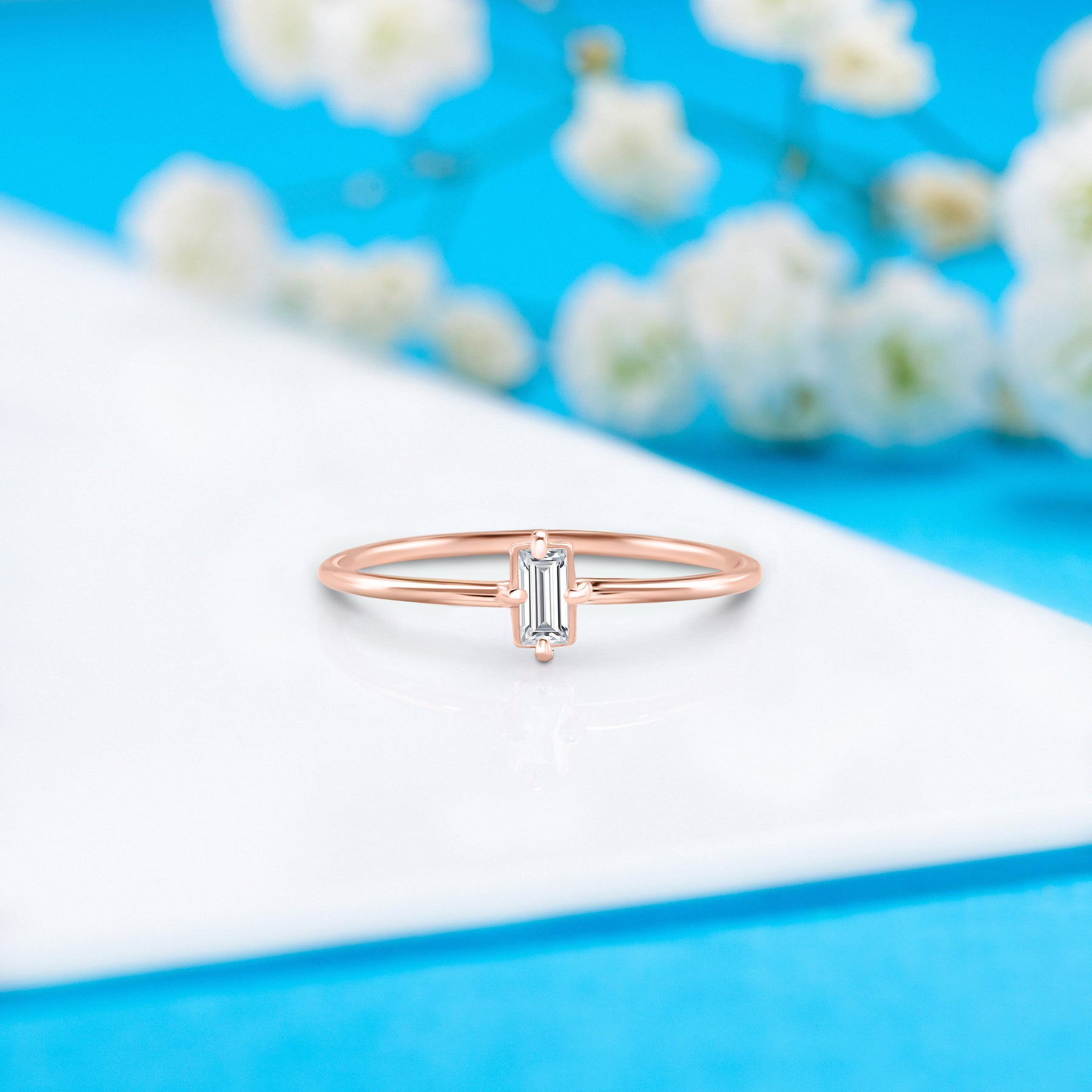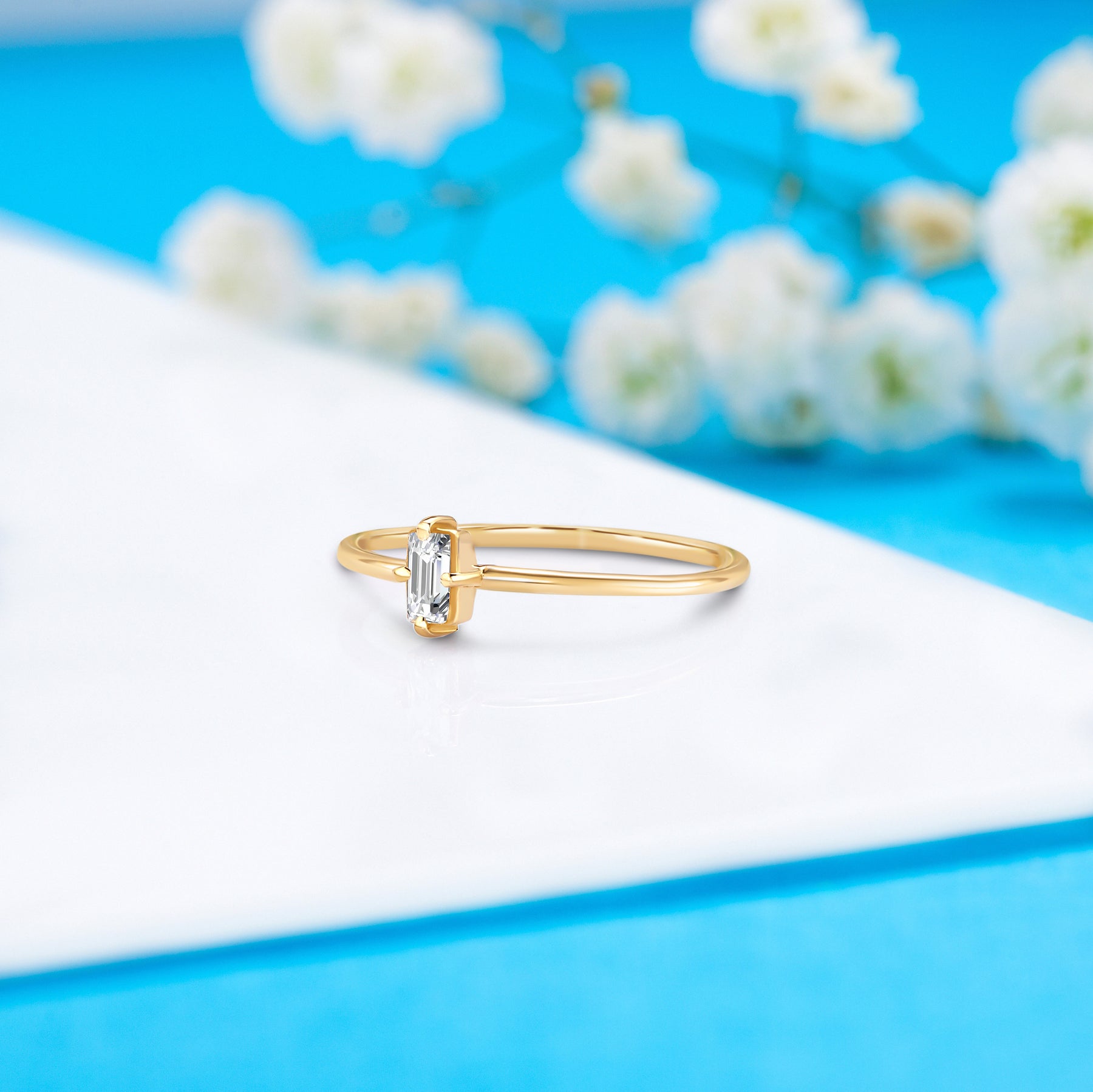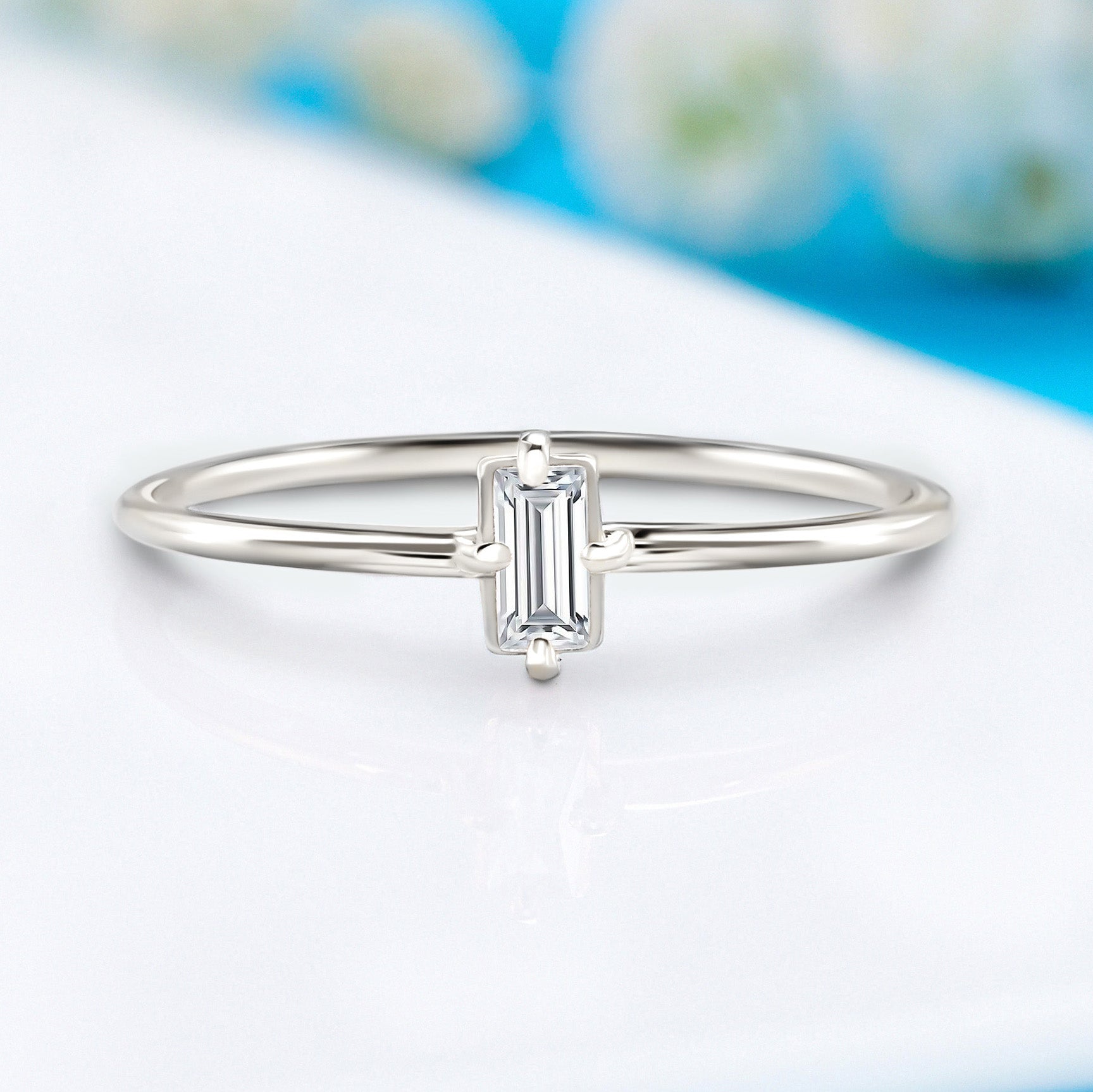Unique dainty 14k white gold baguette diamond solitaire promise ring for her