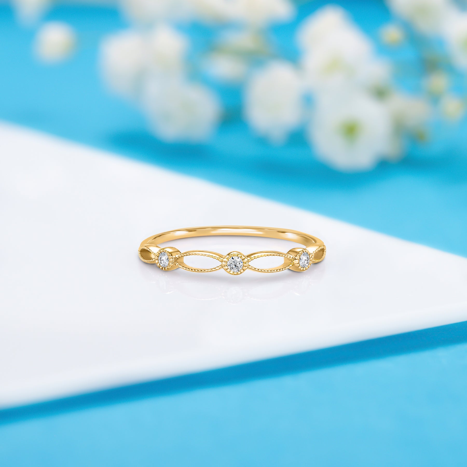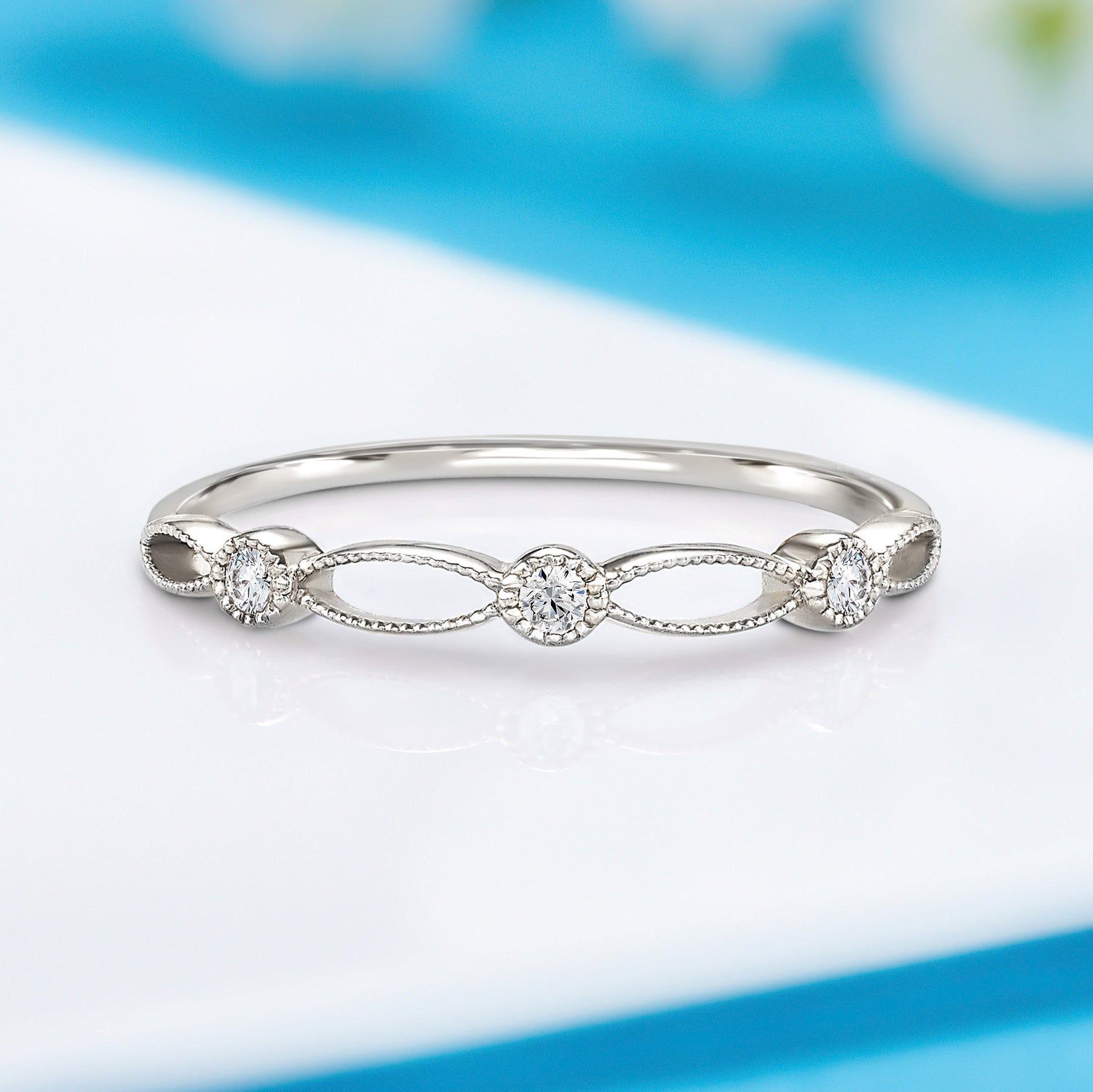 This dainty 14k white gold Art Deco wedding band features three natural diamonds totaling 0.06ct, with H-I color and VVS1-VVS2 clarity. The minimalist design and 1.2mm band add a touch of timeless elegance, making it the perfect wedding band for a refined, understated look.