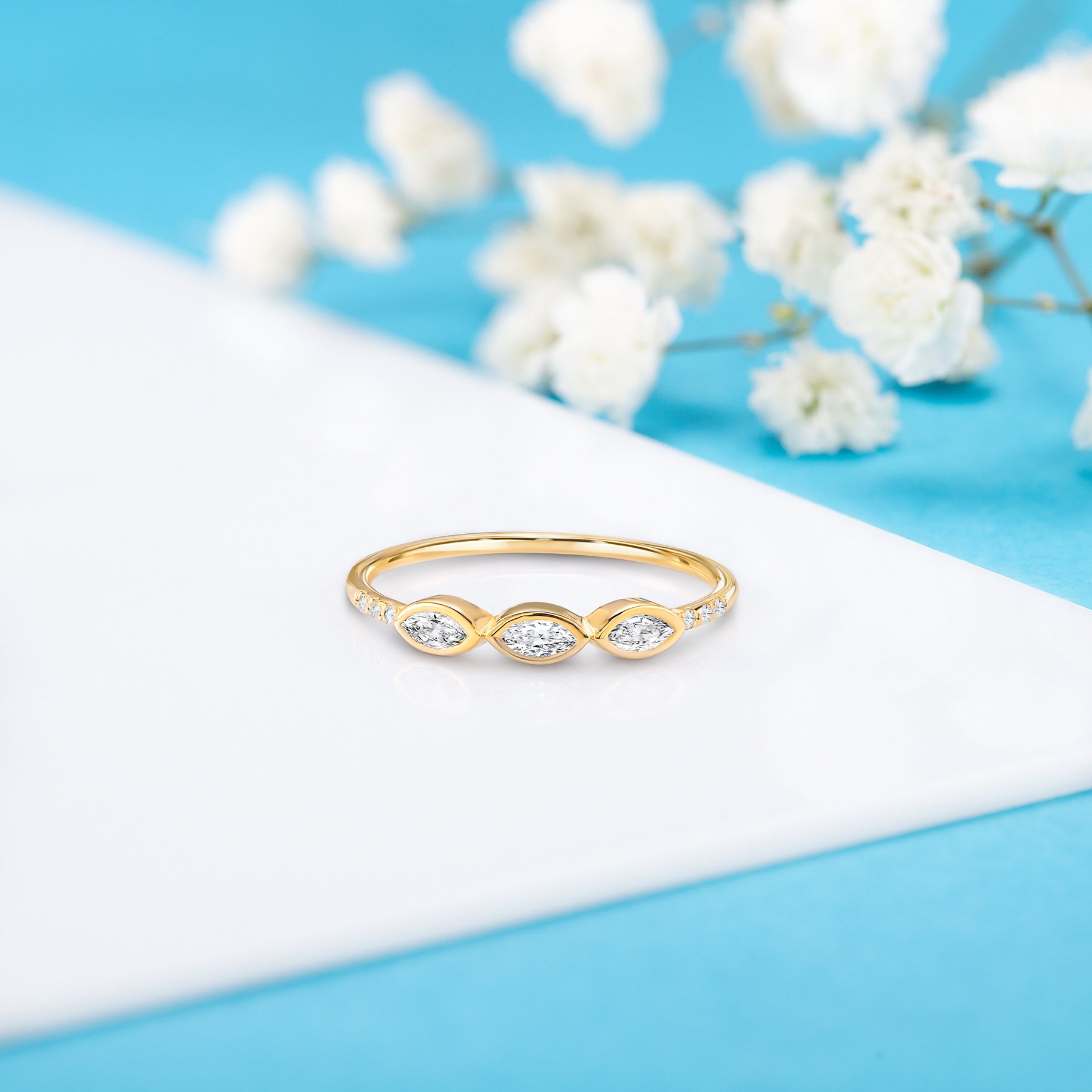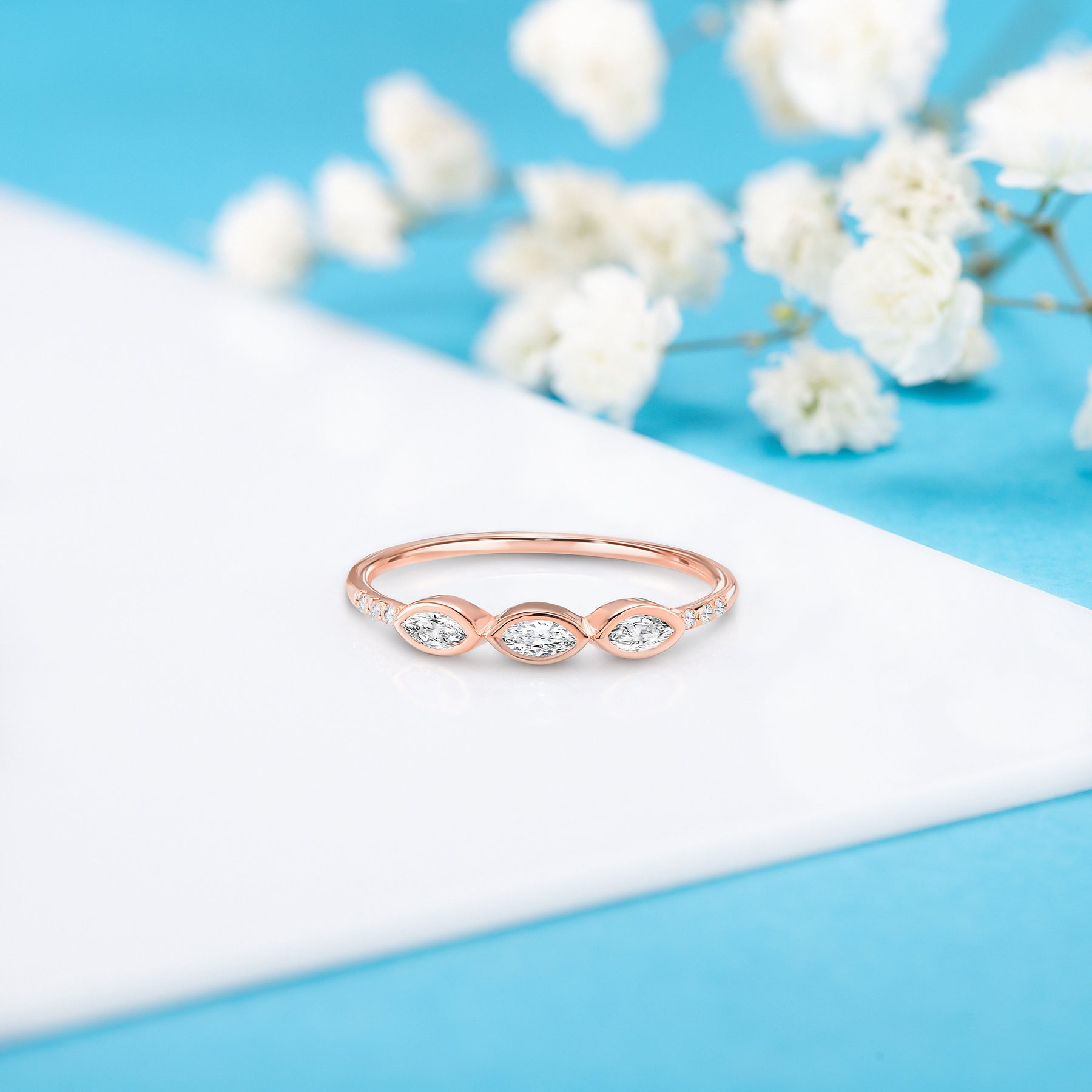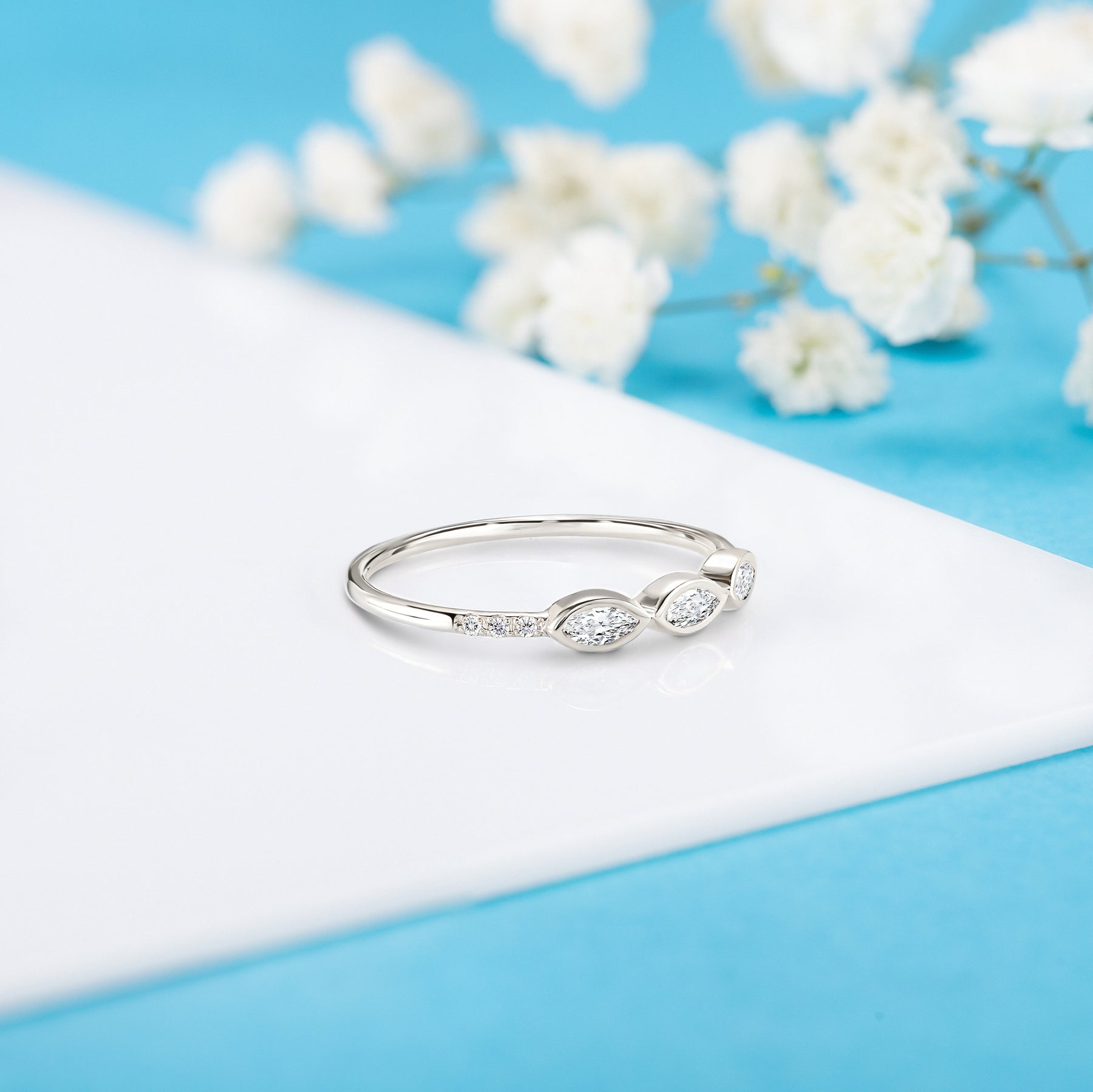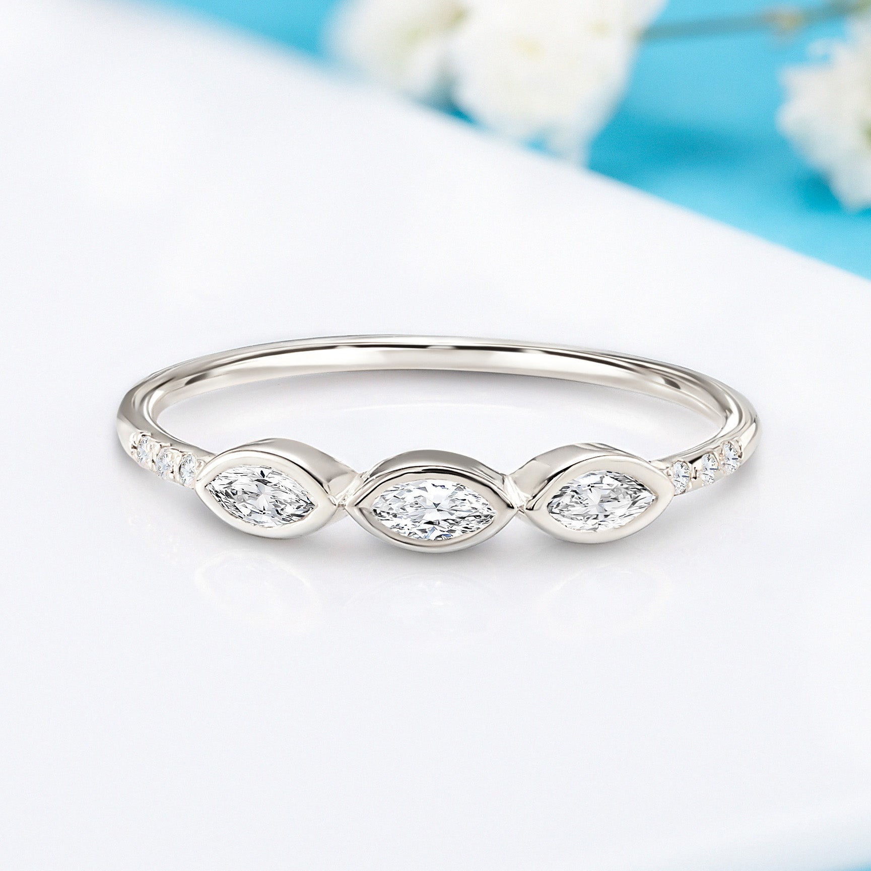Unique minimalist 14k white gold 3 marquise cut diamond engagement ring