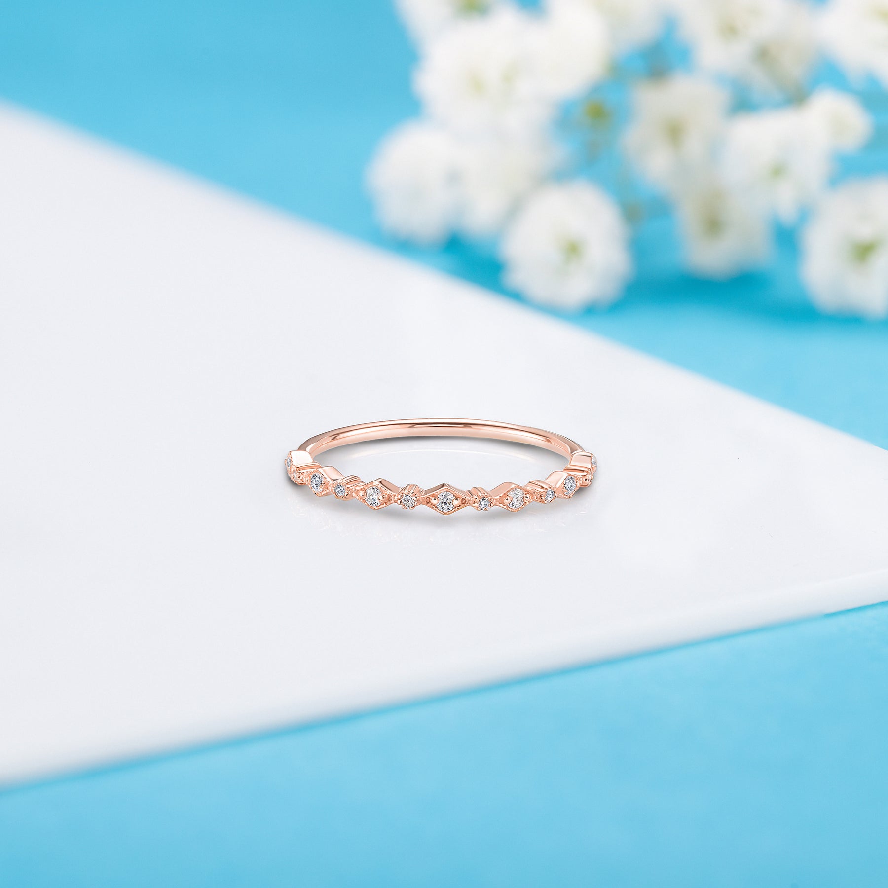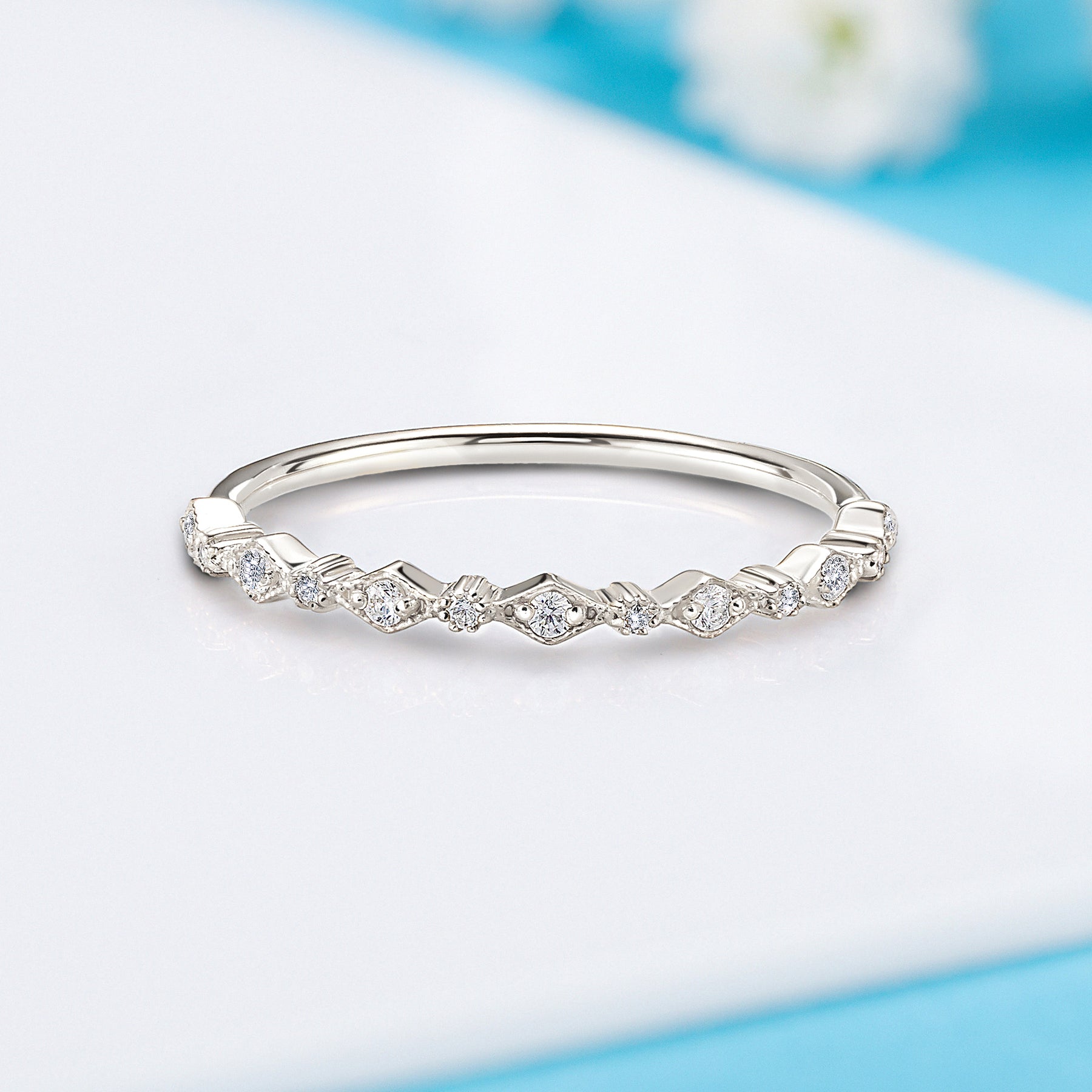 Small delicate women art deco 14k white gold diamond wedding band or stacking ring