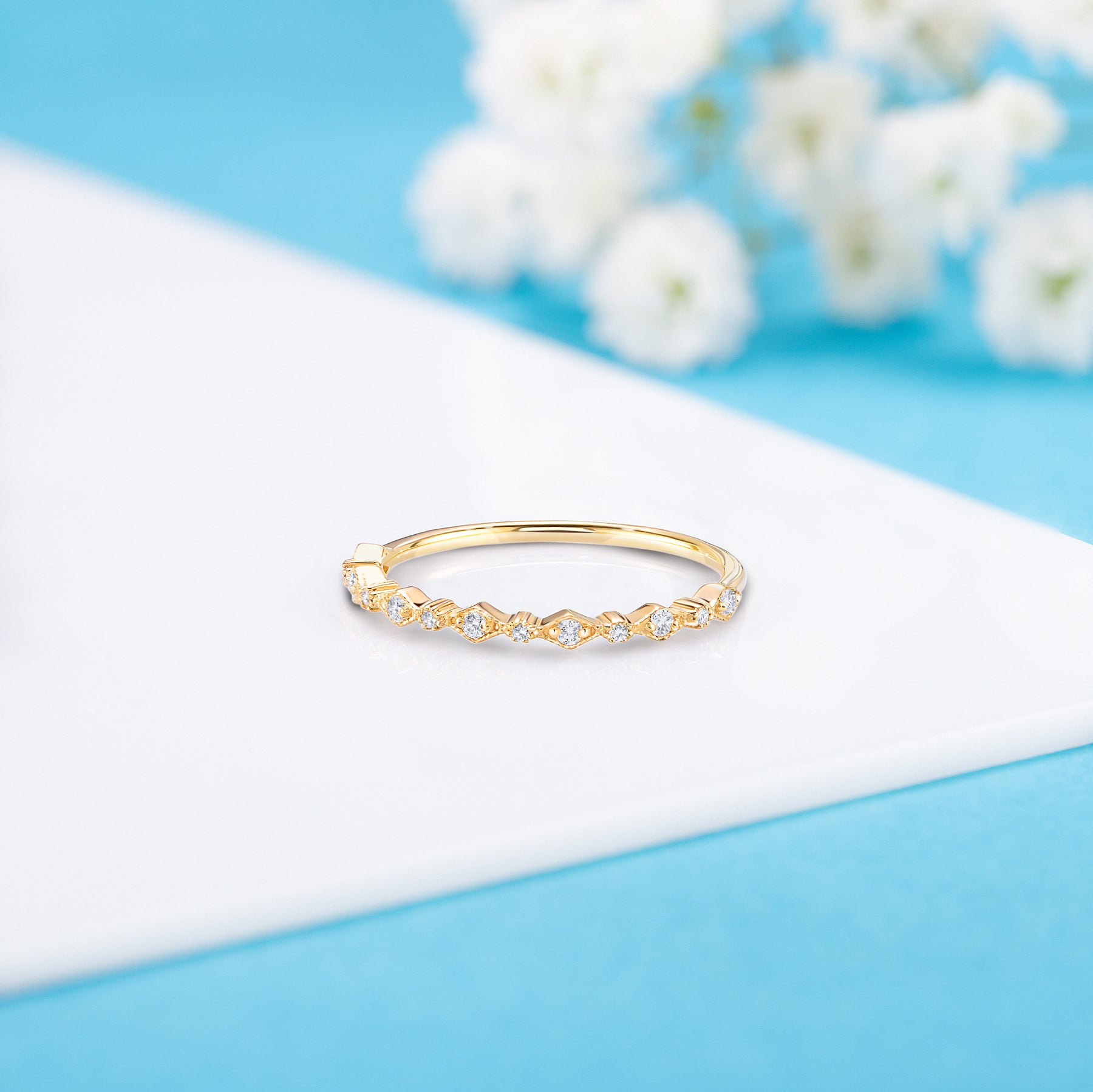 This dainty 14k white gold diamond wedding band is crafted for minimalist elegance. Adorned with 13 natural diamonds totaling 0.086ct, each with H-I color and VVS1-VVS2 clarity, it’s perfect for a refined and timeless look. The slim 1.1mm band adds delicate sparkle, making it a beautiful choice for a wedding band or stacking ring.