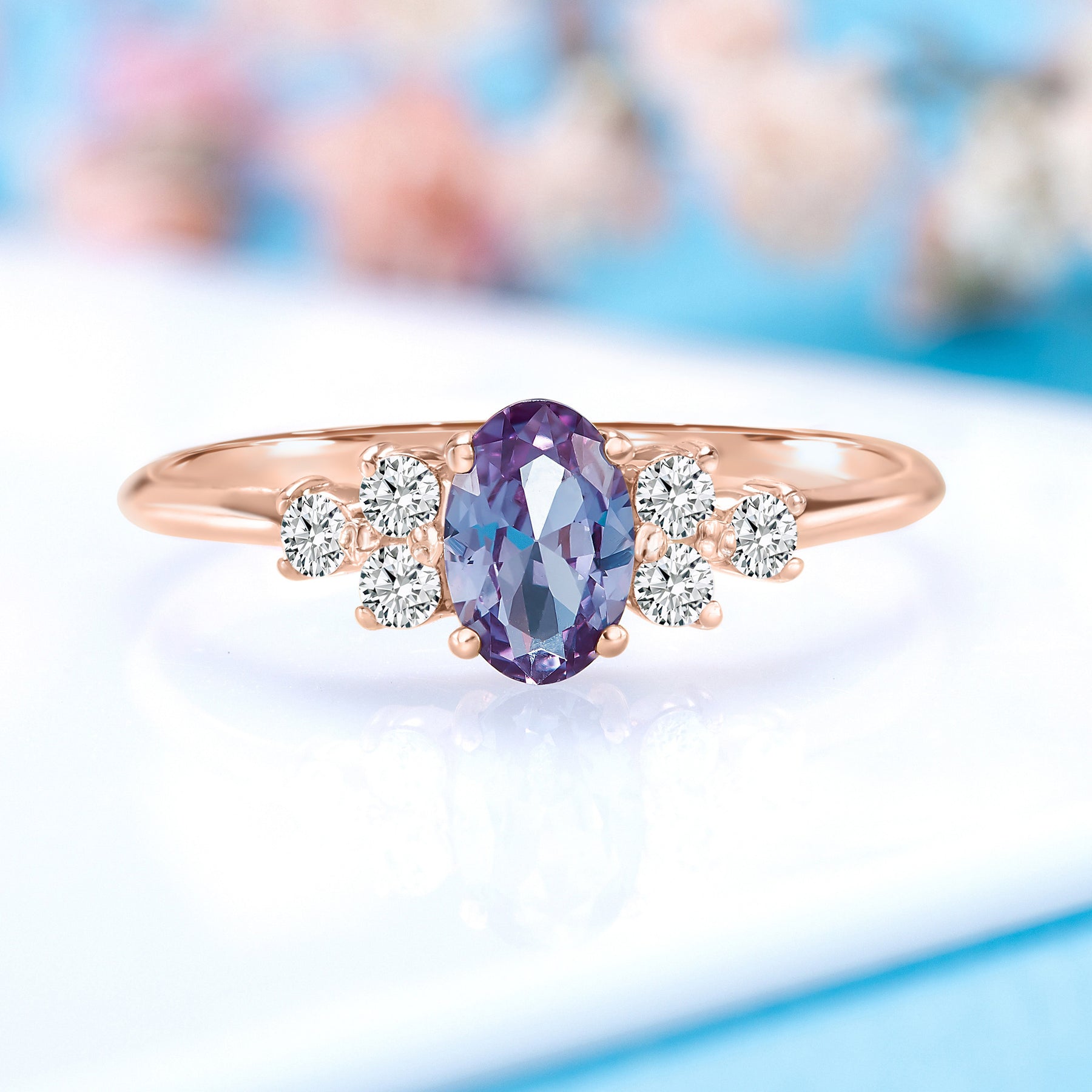 Dainty& elegant 14 rose gold oval alexandrite & diamonds cluster engagement ring