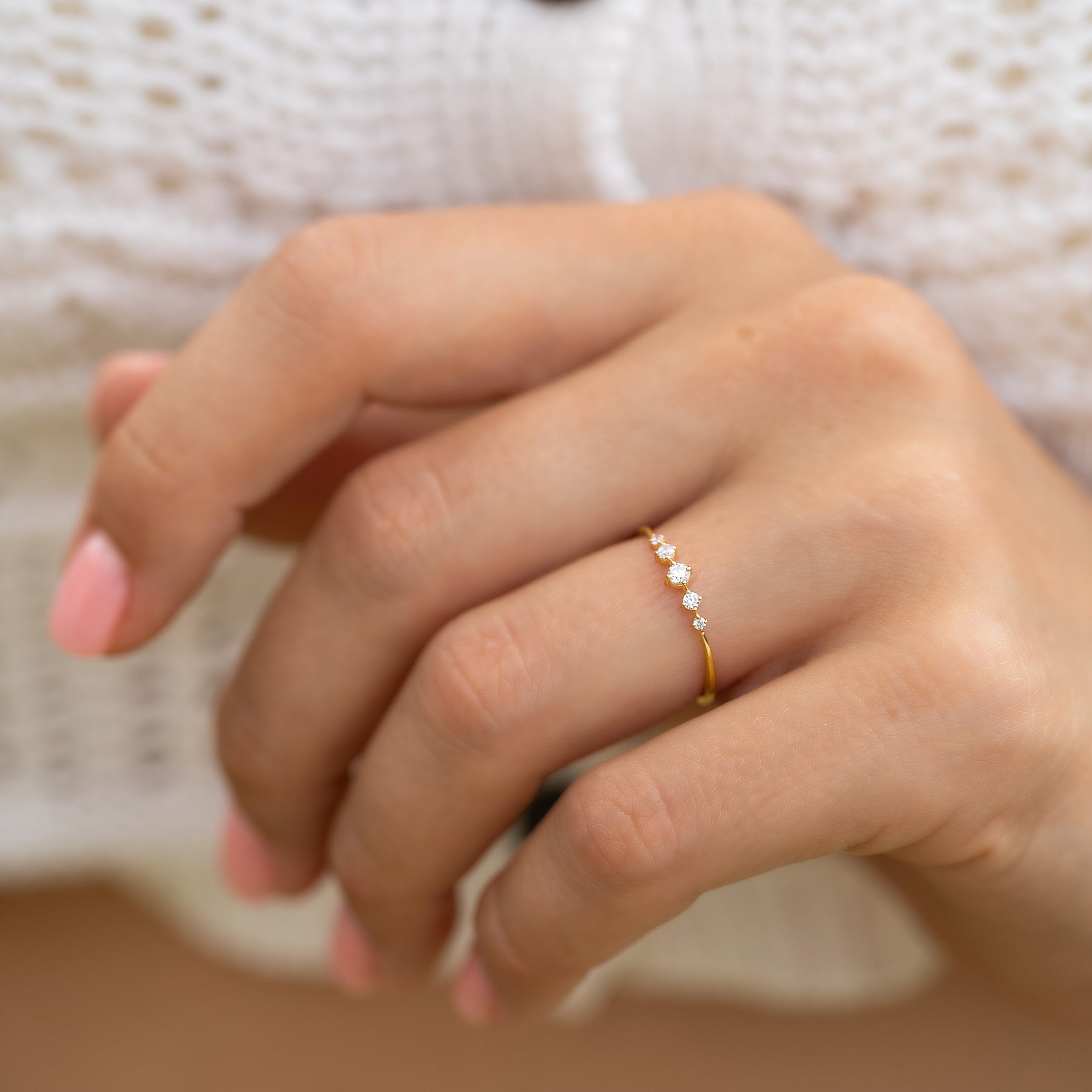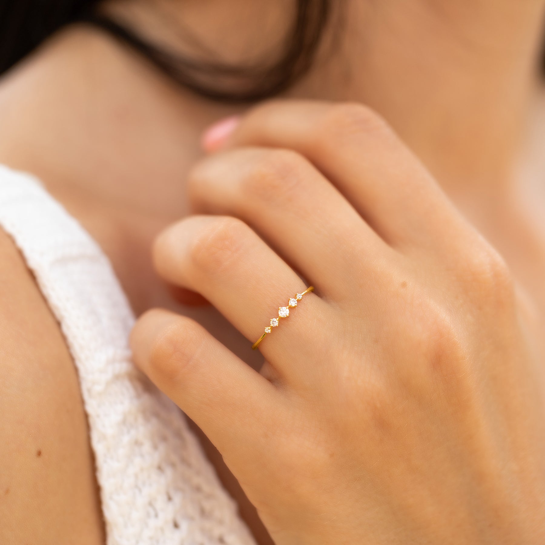 This stunning diamond promise ring in 14k yellow gold is the perfect expression of your love and commitment. Featuring a total of five natural diamonds—one 2.25mm stone, two 1.75mm stones, and two 1.25mm stones—totaling 0.105ct, this ring radiates brilliance and elegance. The diamonds, with H-I color and VVS1-VVS2 clarity, are beautifully set along a delicate 1.1mm band. Designed for her, this ring is a timeless and meaningful symbol of your special bond.