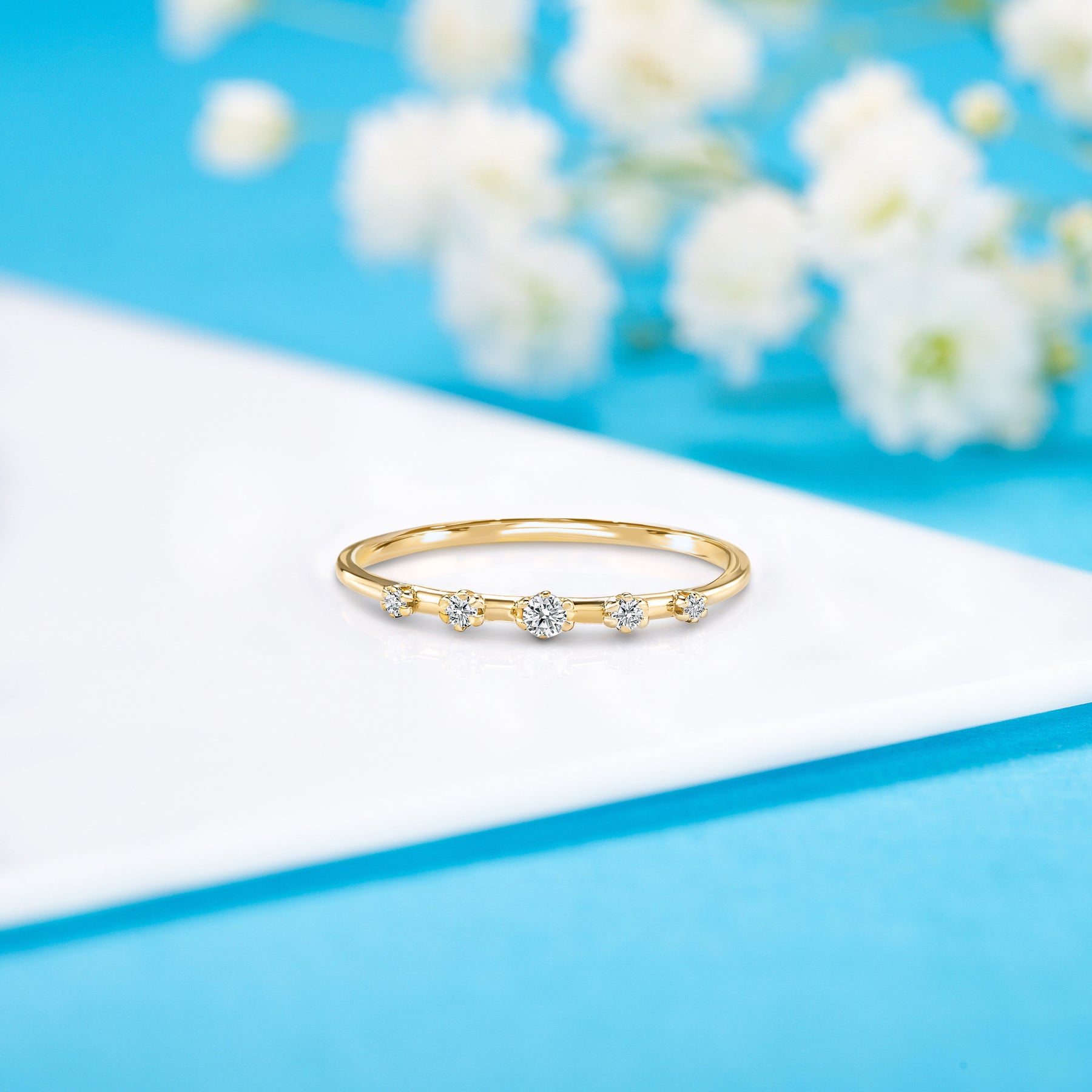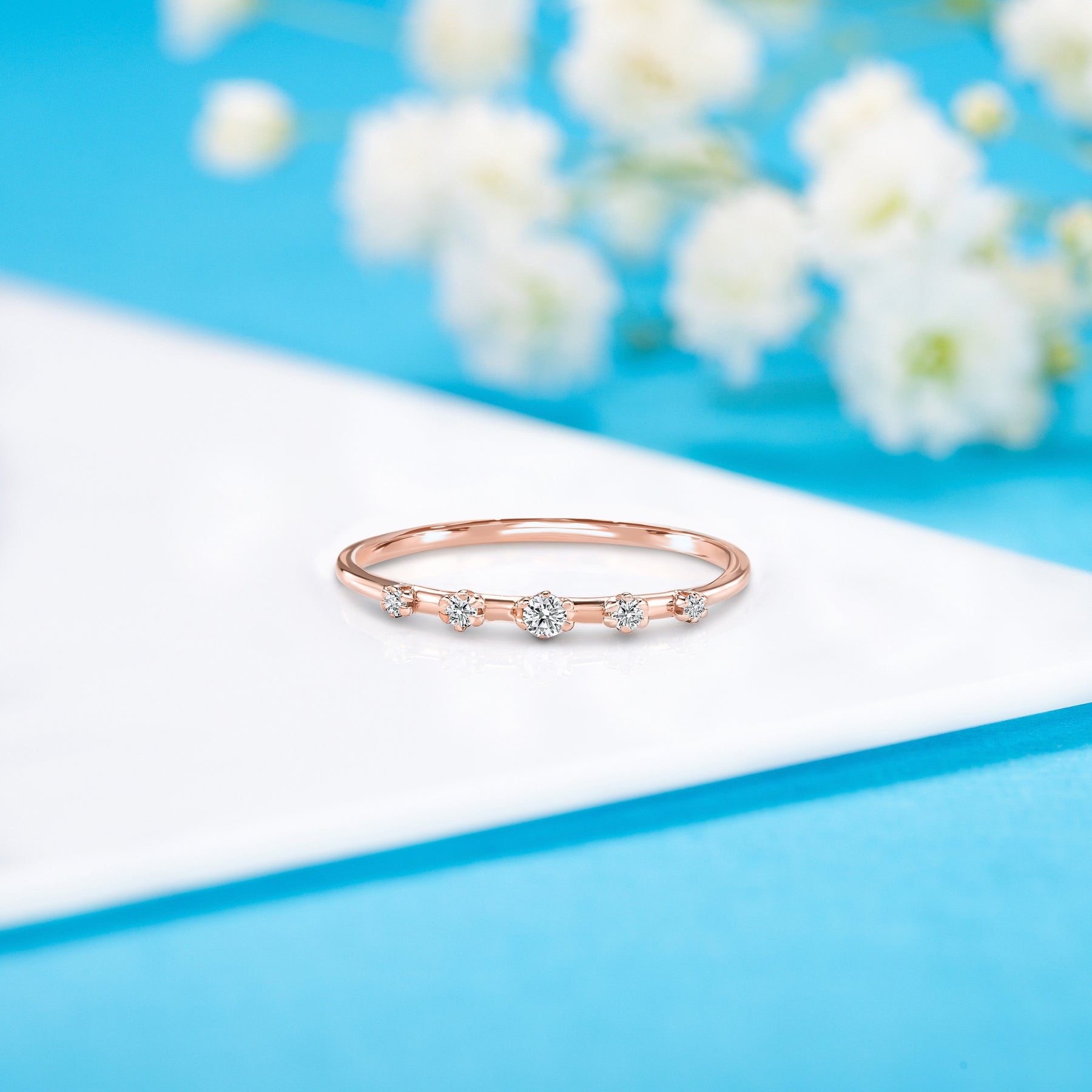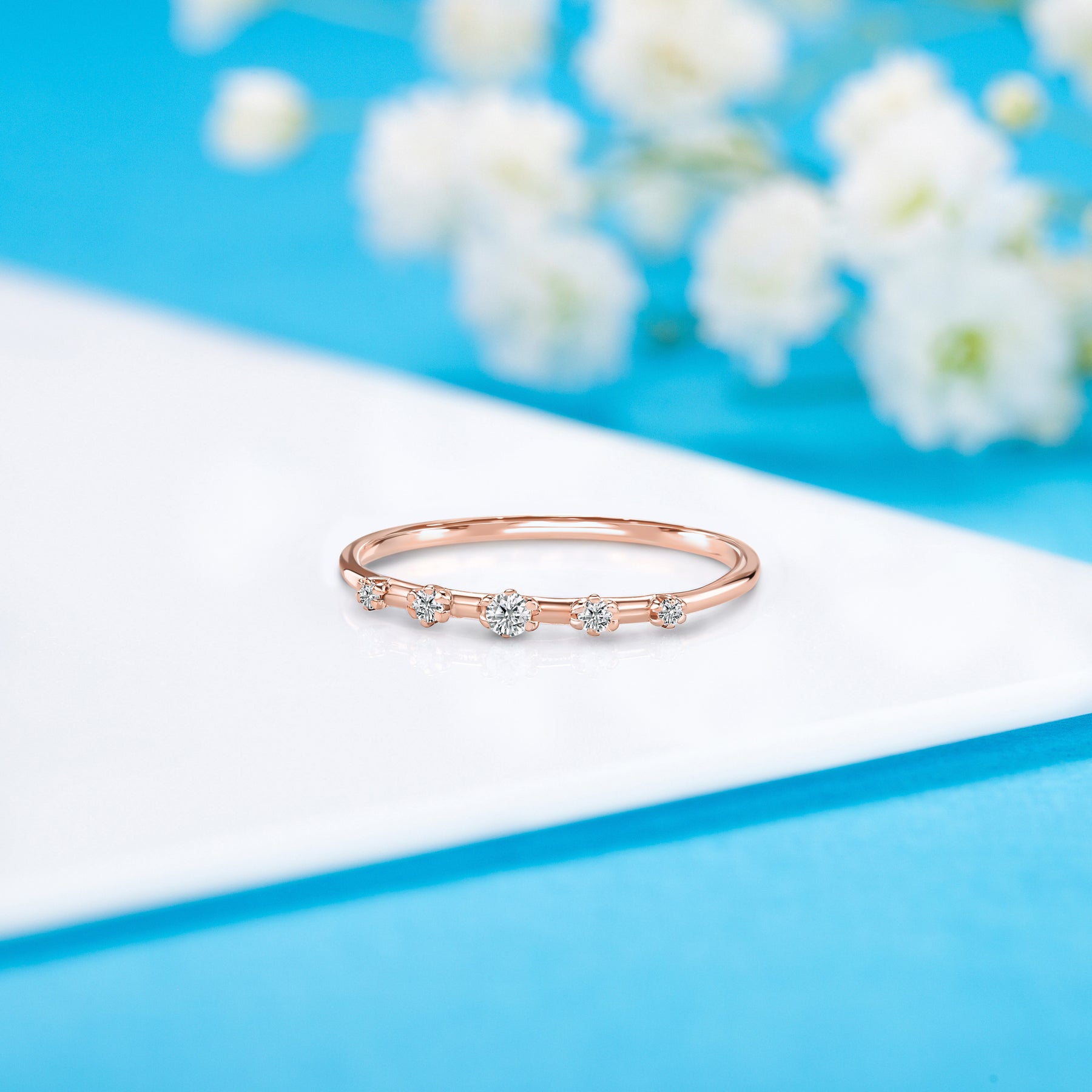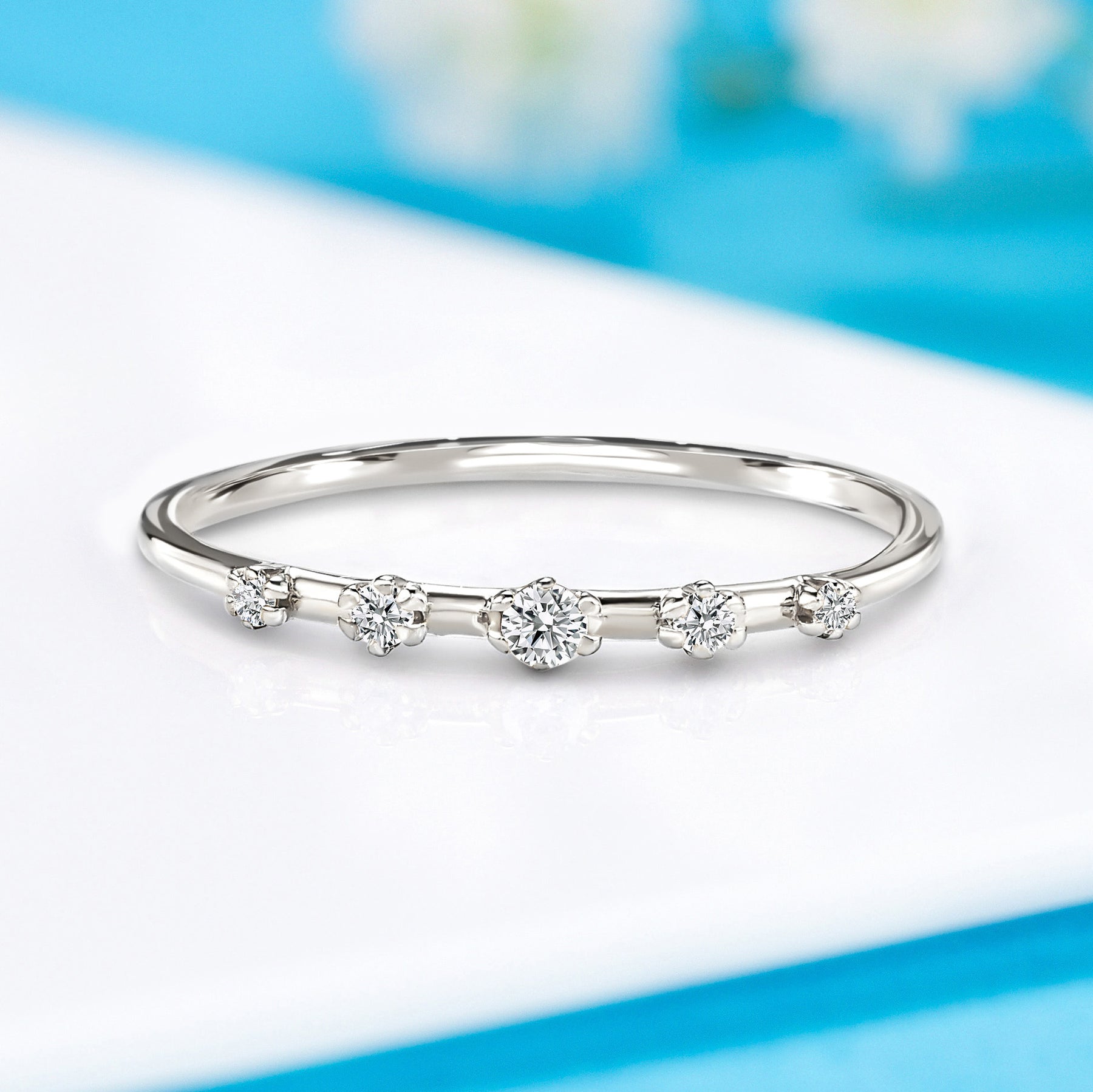 This unique minimalist 14k white gold diamond promise ring is a delicate yet stunning symbol of your commitment. Featuring five natural diamonds—one 2.0mm stone, two 1.5mm stones, and two 1.25mm stones—totaling 0.08ct, the ring offers a subtle yet captivating sparkle. With H-I color and VVS1-VVS2 clarity, these diamonds are set on a sleek 1.2mm white gold band, combining timeless elegance with modern simplicity. This ring is the perfect way to express your love with understated beauty.