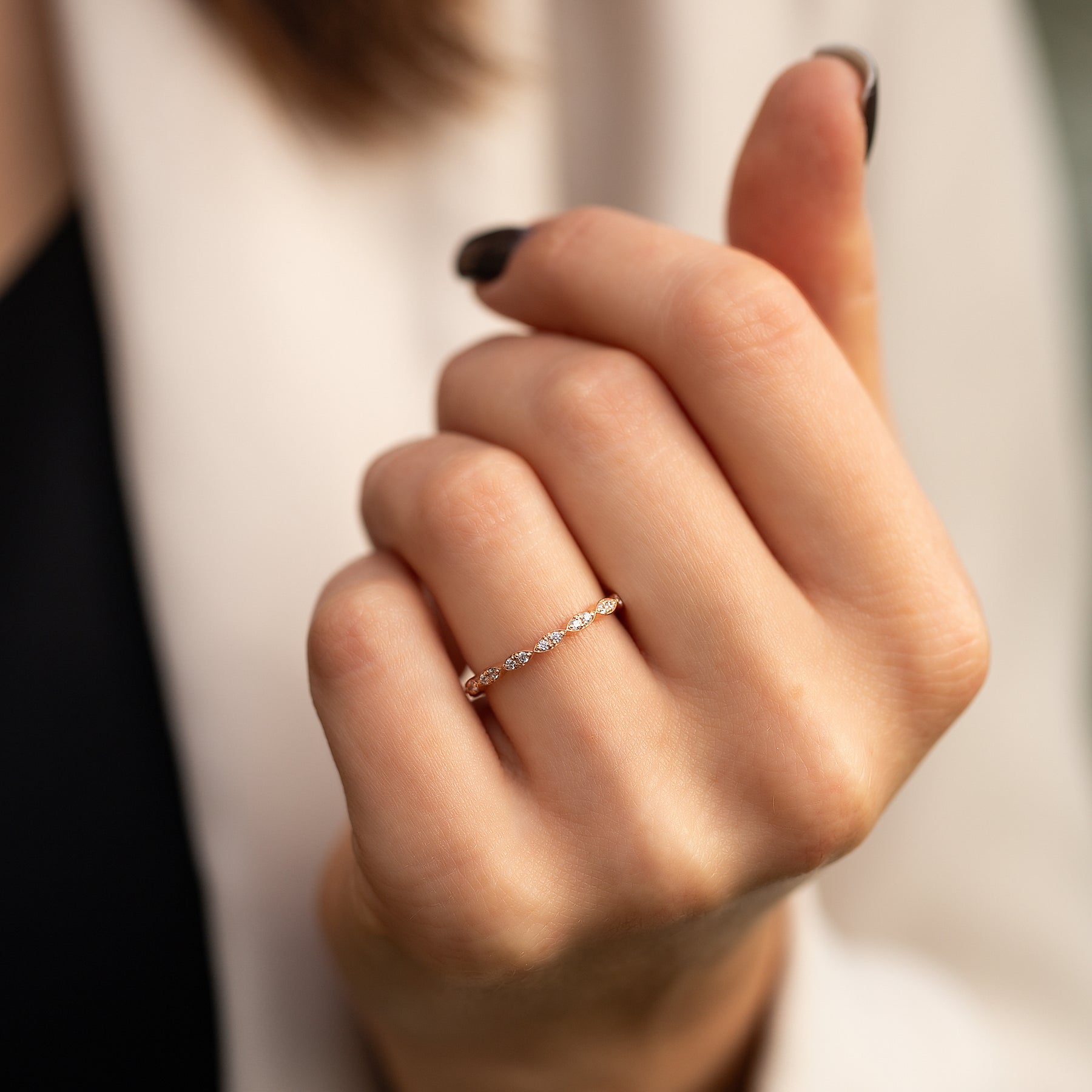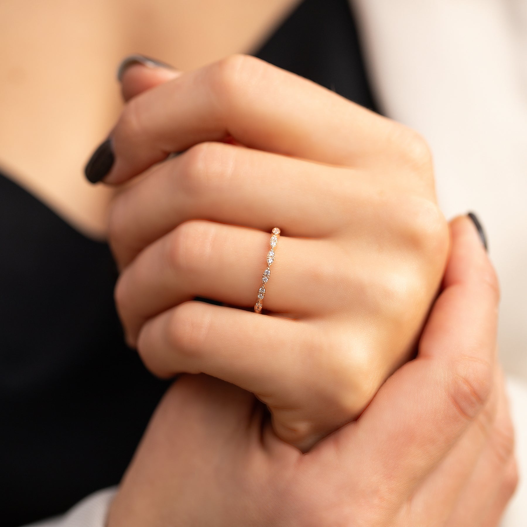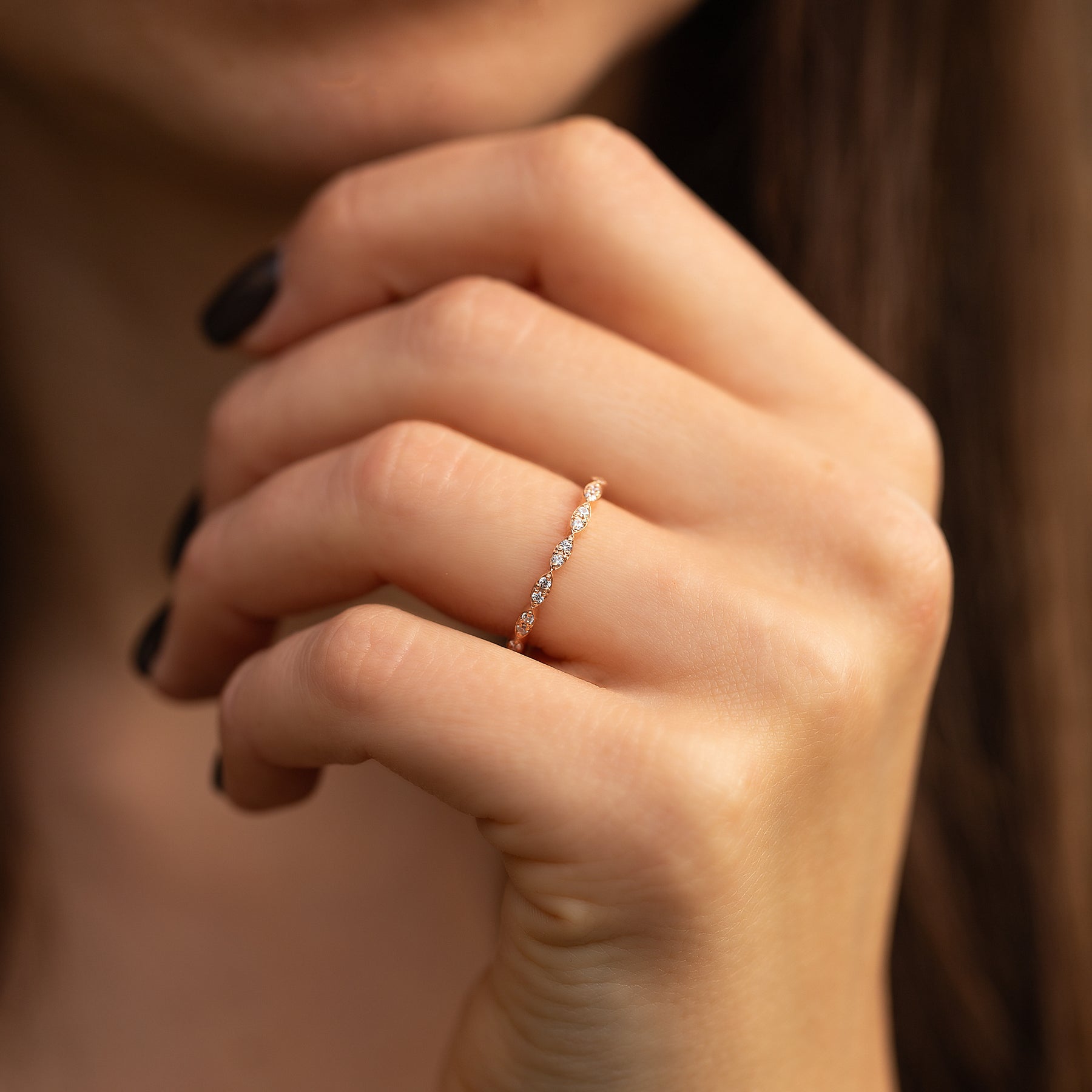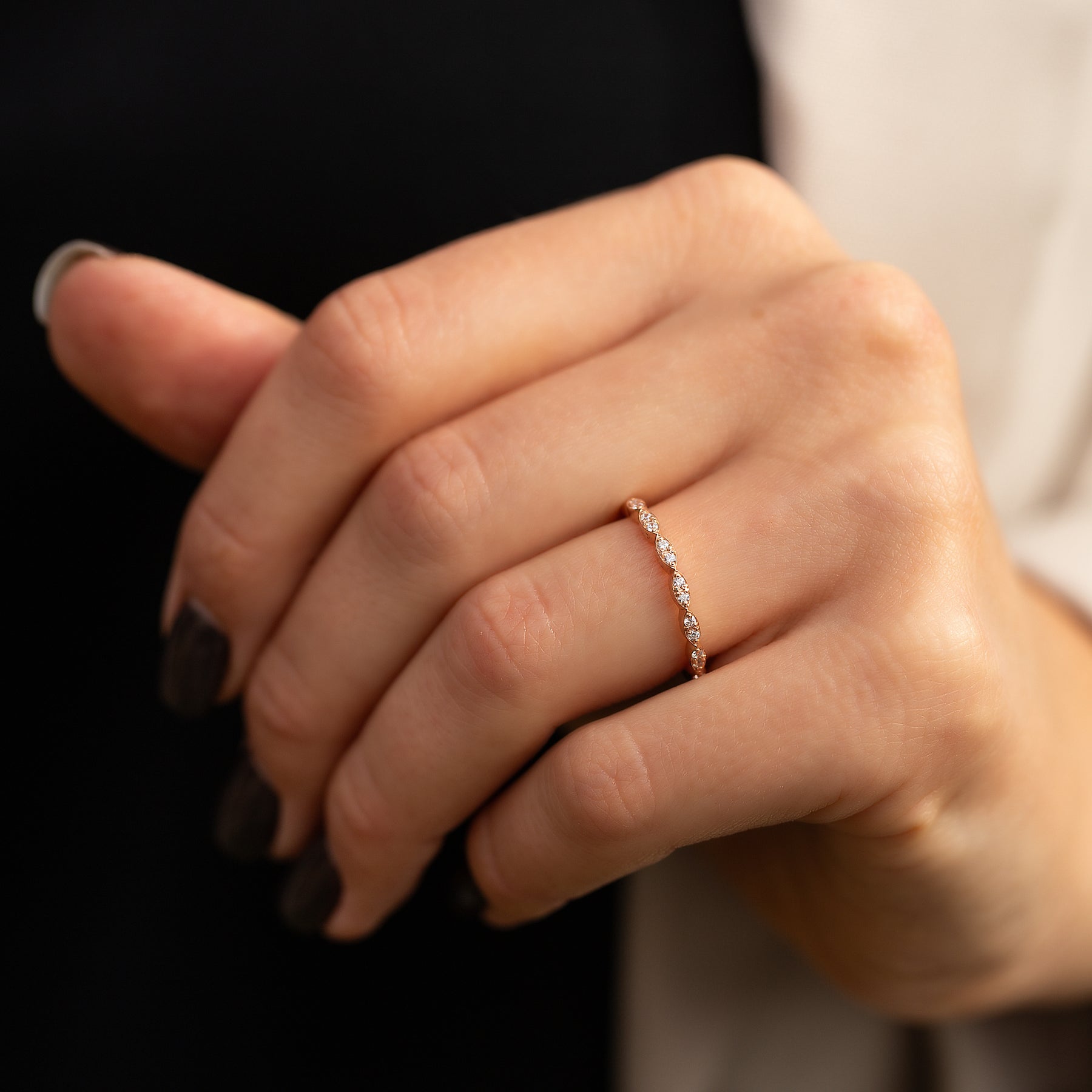 This dainty Victorian-inspired 14k rose gold diamond wedding band captures vintage elegance. Adorned with 18 natural diamonds totaling 0.144ct, each with H-I color and VVS1-VVS2 clarity, this 1.2mm band is a perfect blend of timeless style and delicate sparkle.