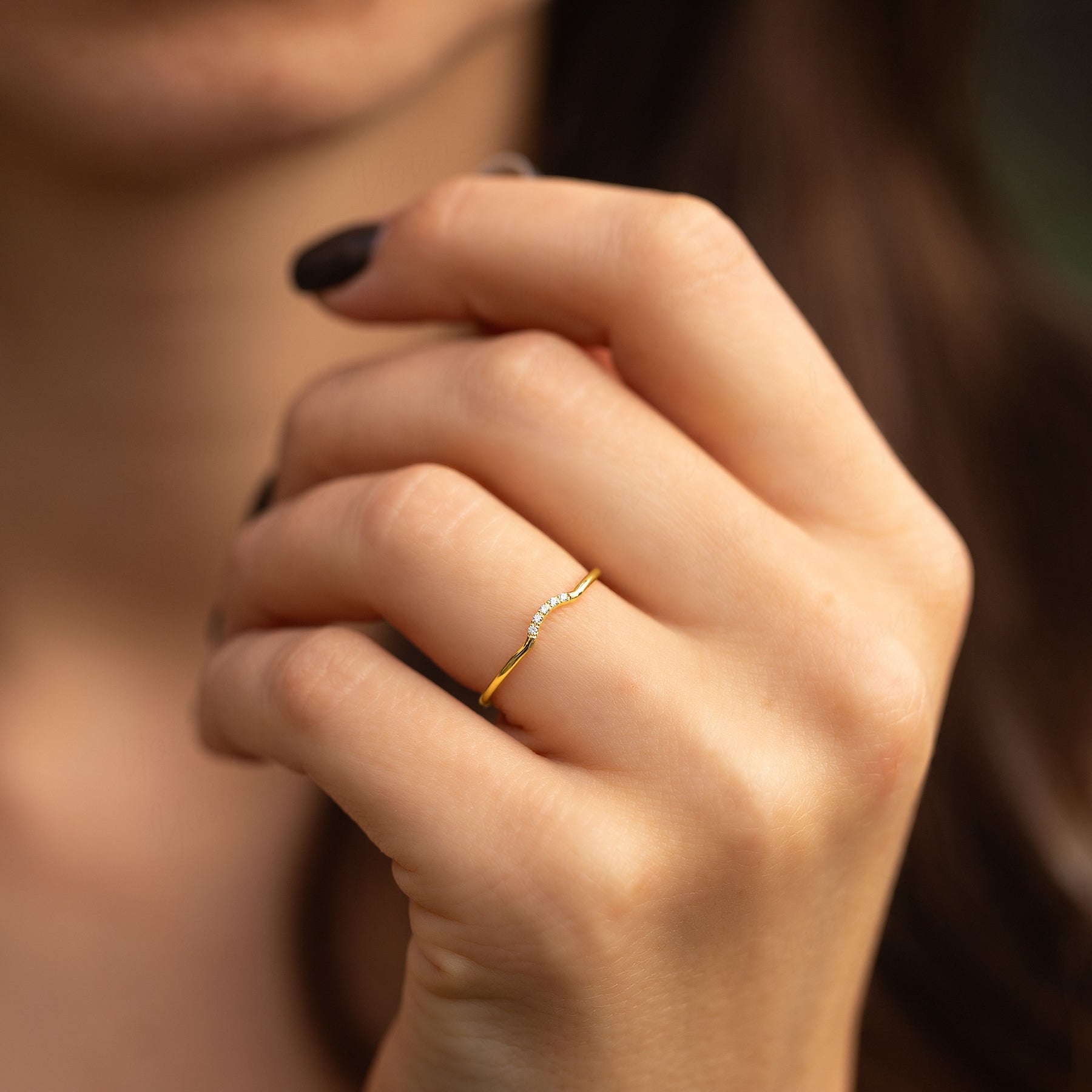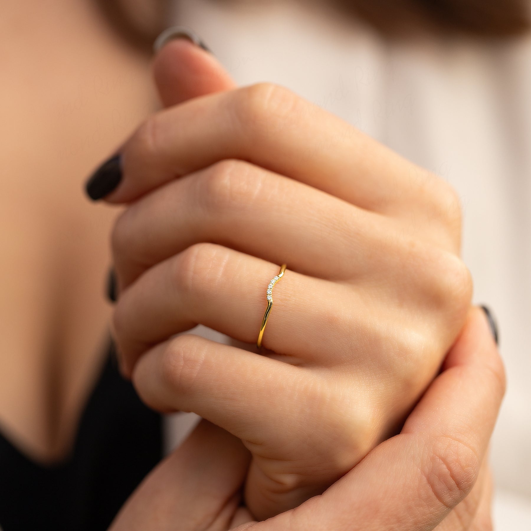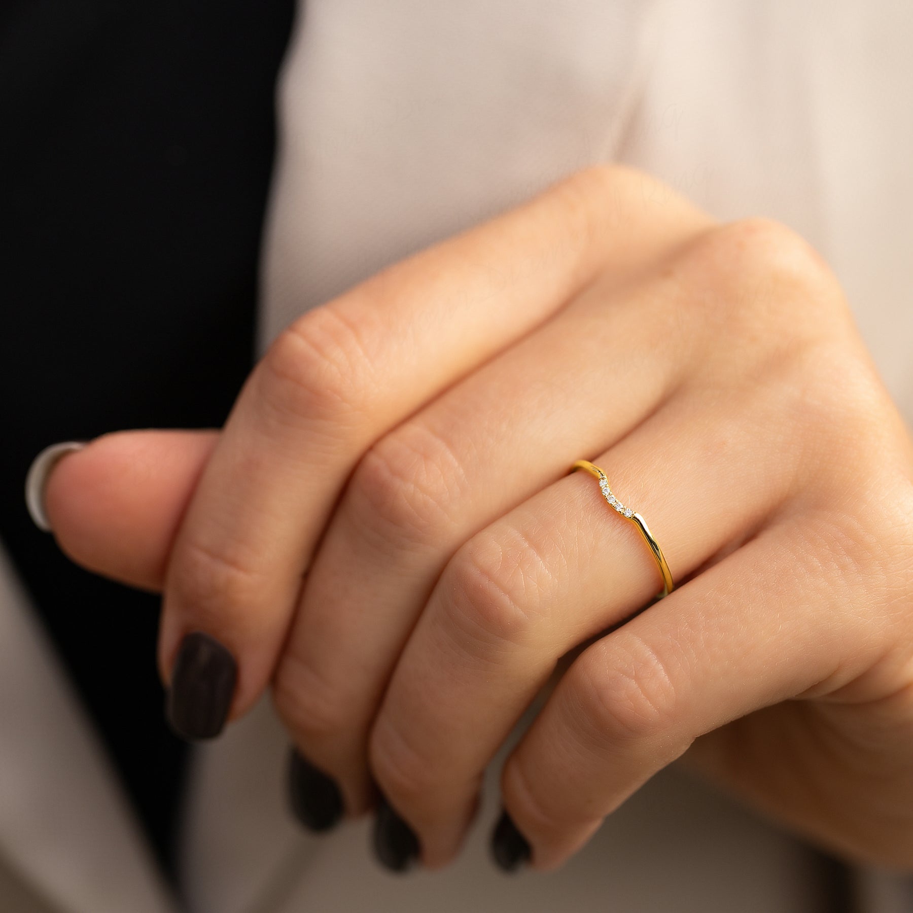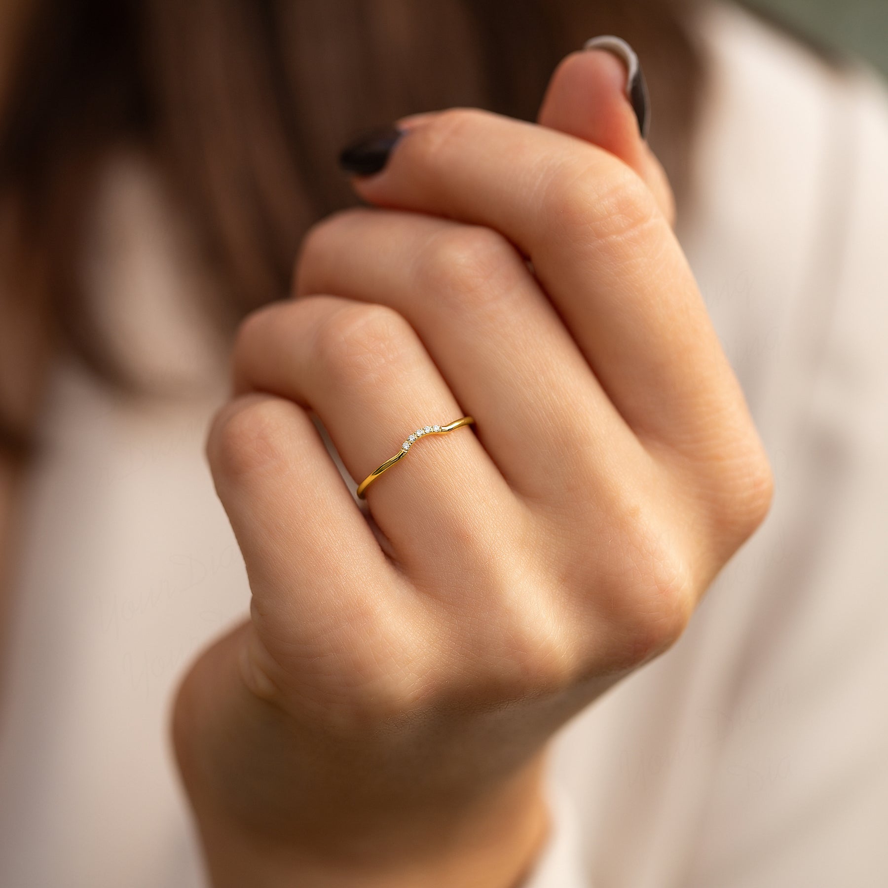 Dainty minimalist women 14k yellow gold chevron diamond wedding band or stacking ring