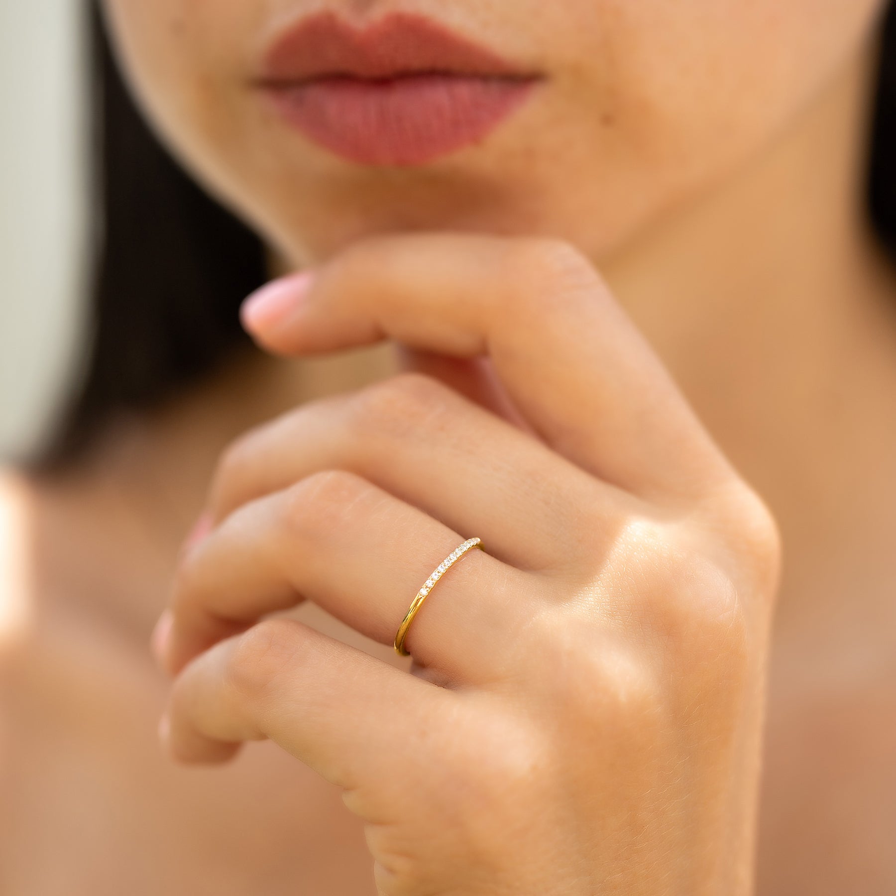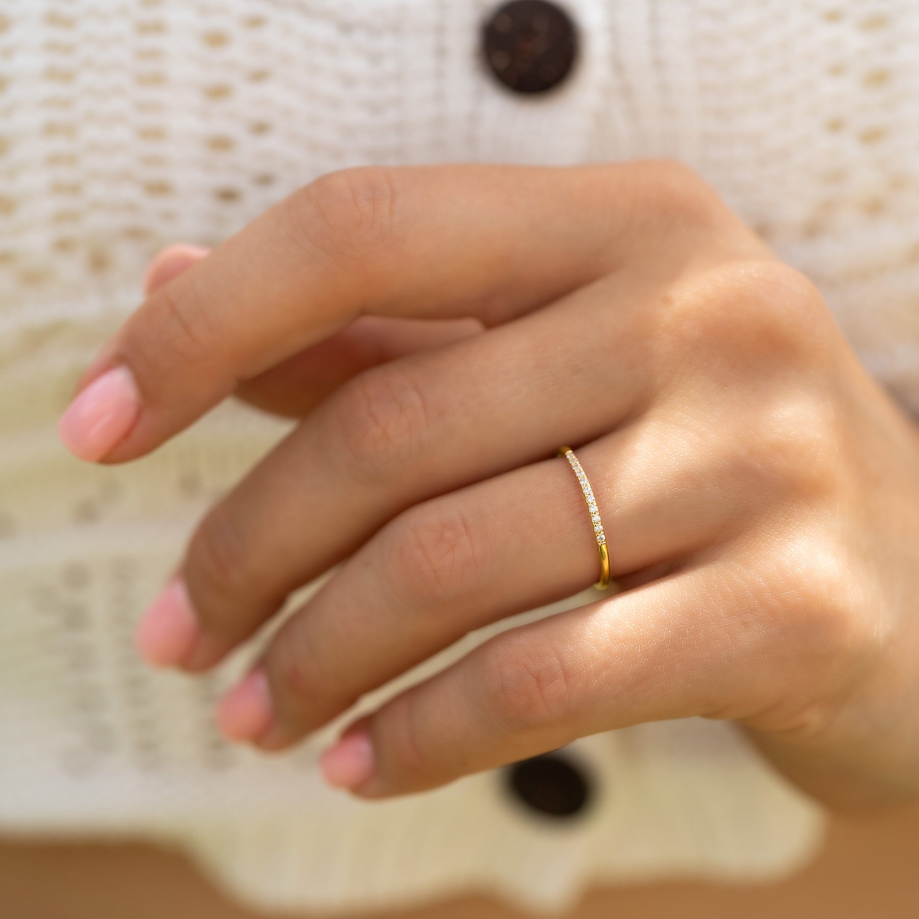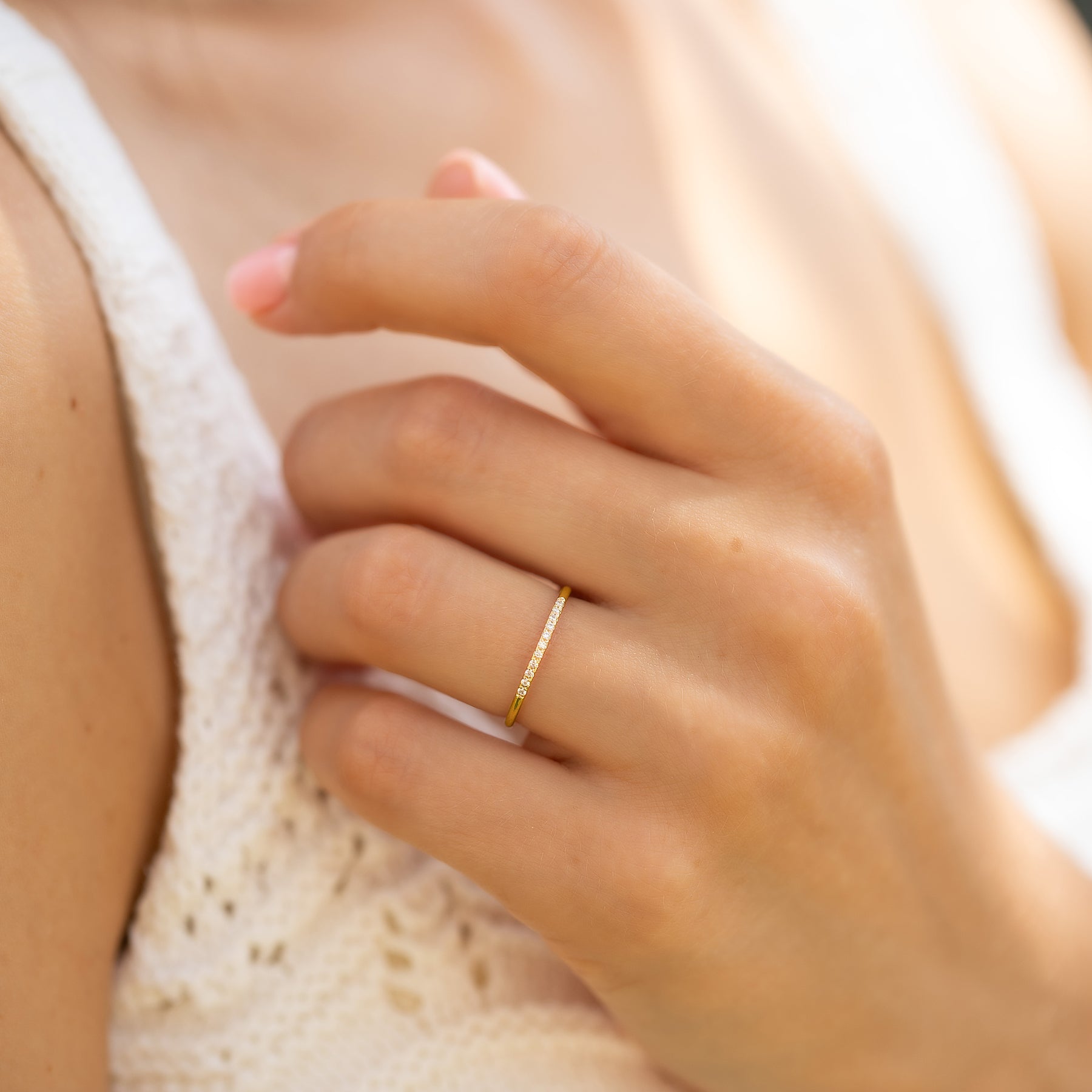 Minimalist delicate 14k yellow gold diamond pave wedding band