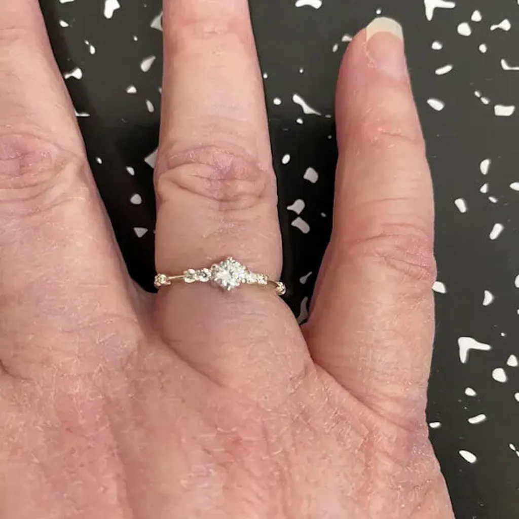 Elevate your promise with our Simple & Dainty Diamond Promise Ring for Her. This exquisite piece features a captivating 4.0mm natural diamond at its heart, complemented by six delicate 1.75mm diamonds, all set in the warm embrace of 14k Rose Gold.