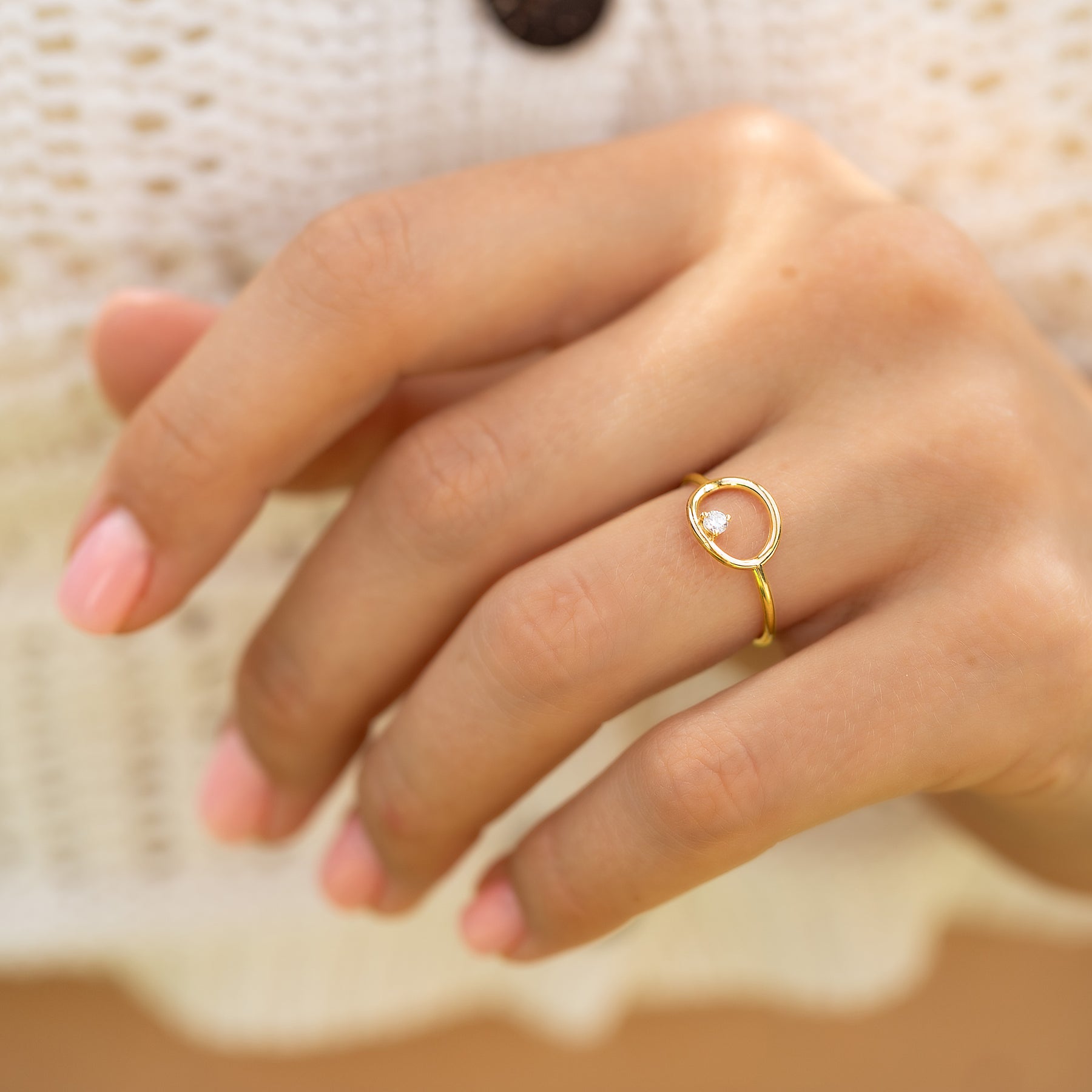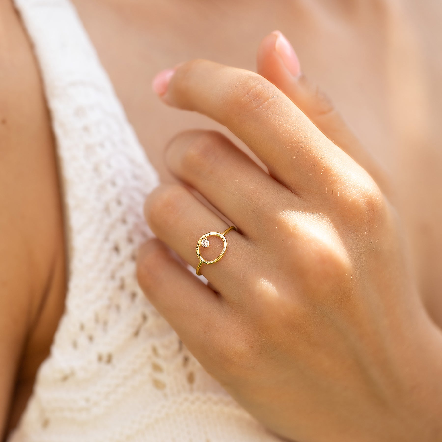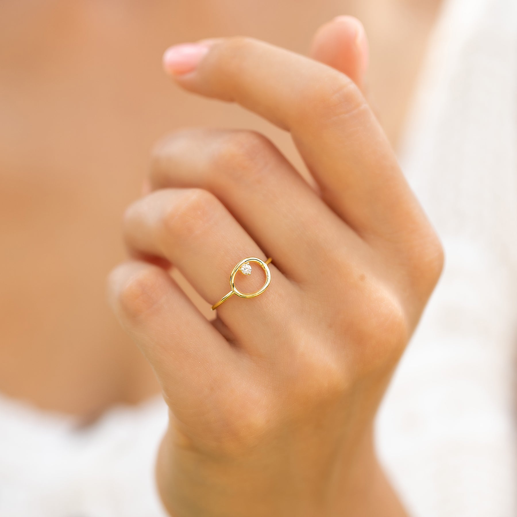 Unique 14k yellow gold solitaire diamond women geometric circle engagement ring