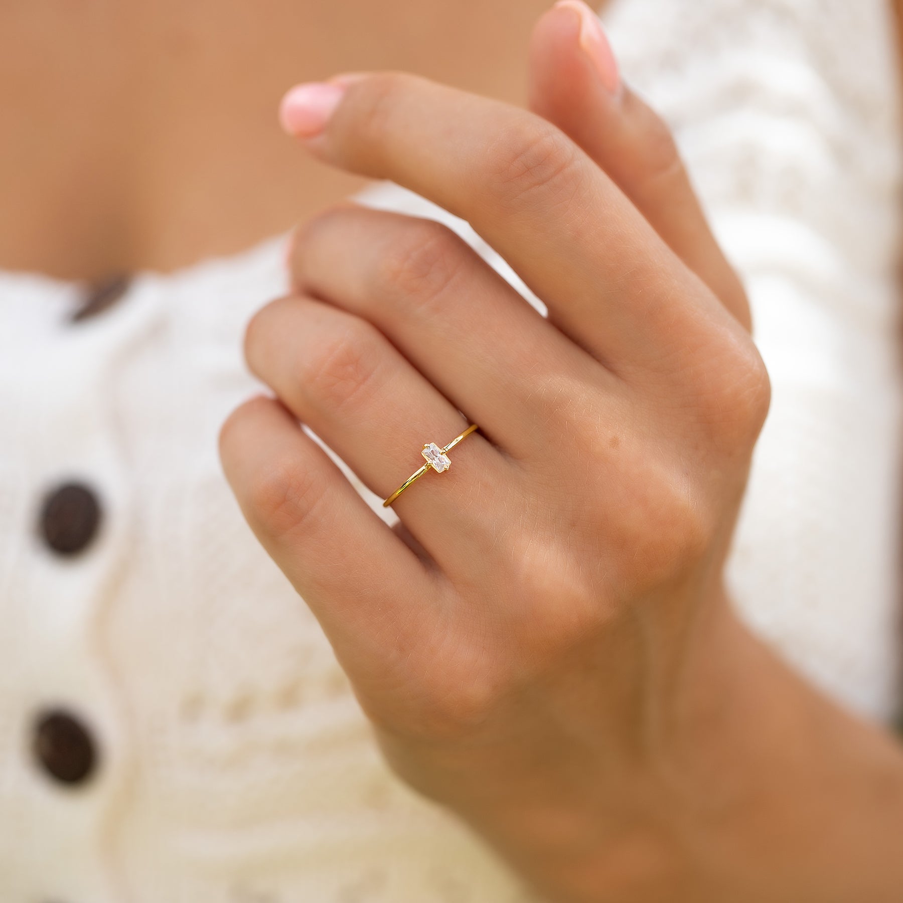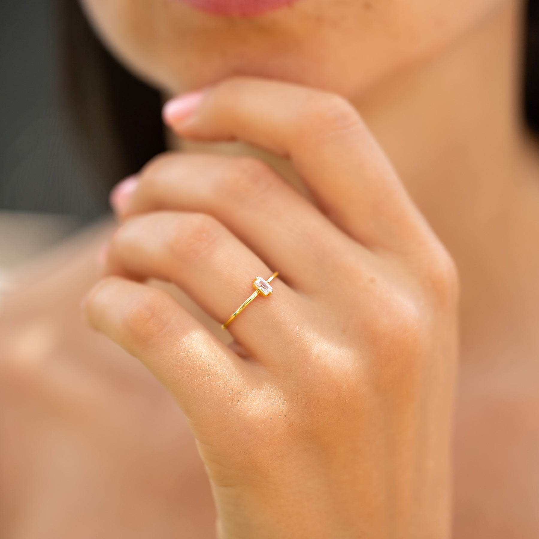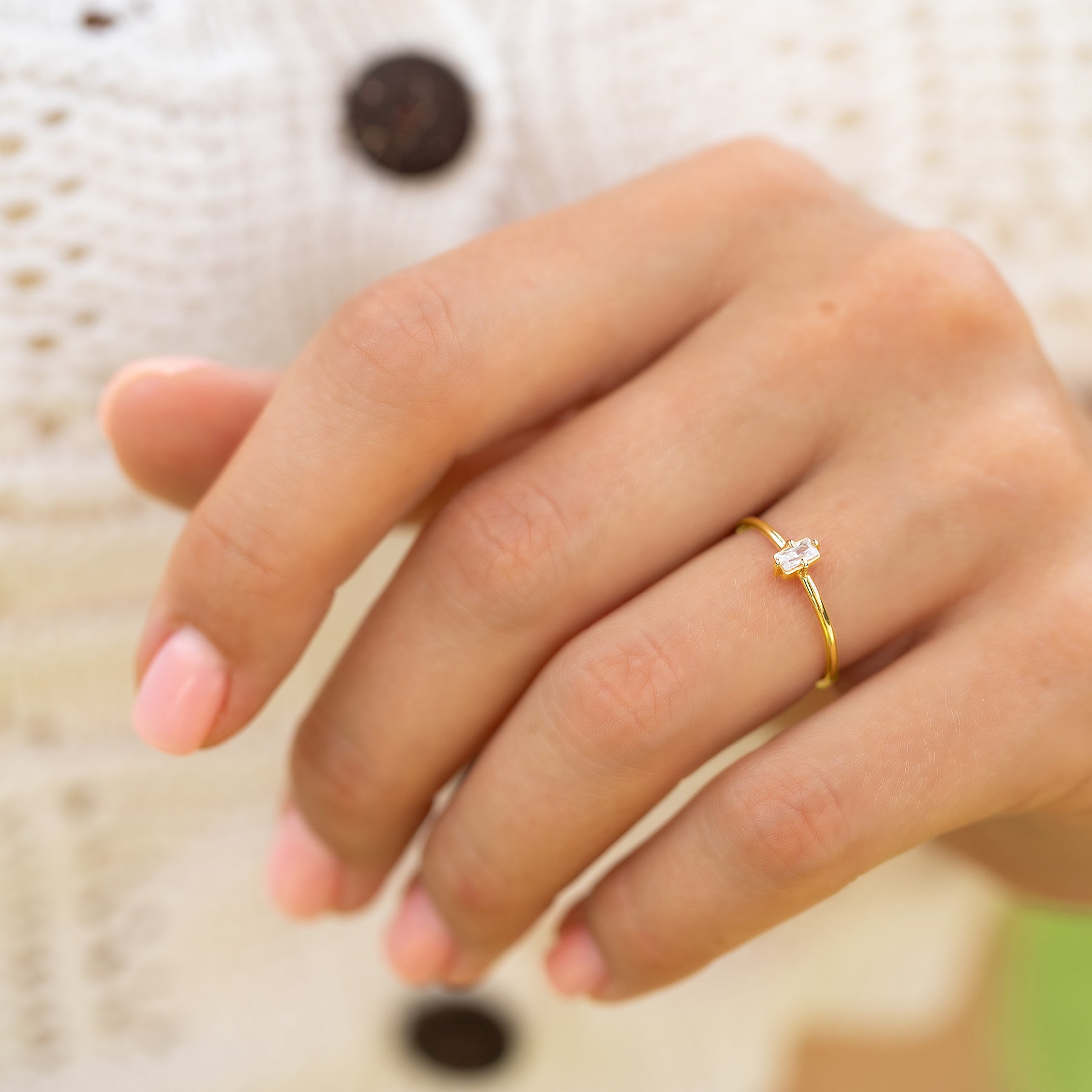 Unique dainty 14k yellow gold baguette diamond solitaire promise ring for her