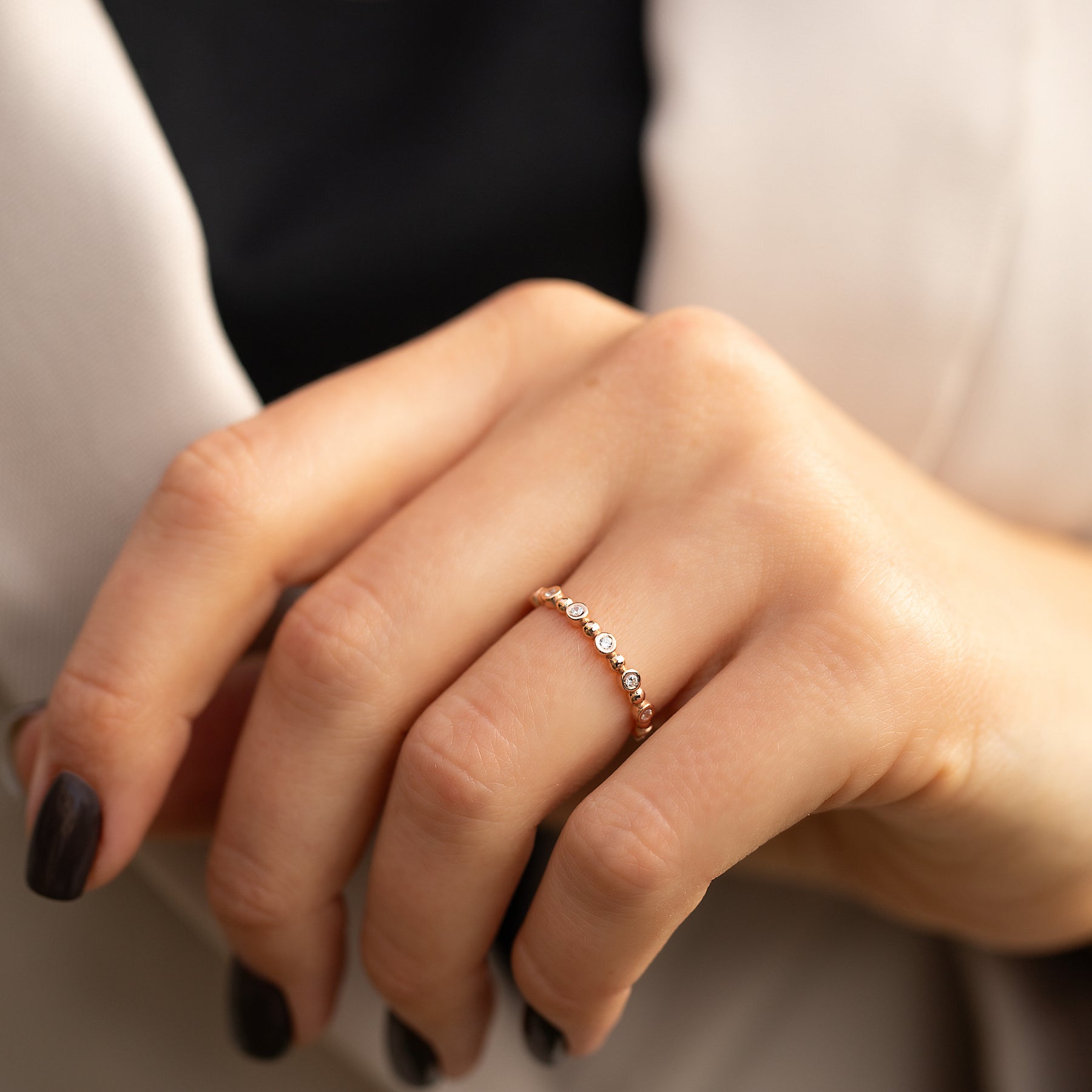 Unique minimalist 14k rose gold bezel set diamond wedding band or stacking ring for her