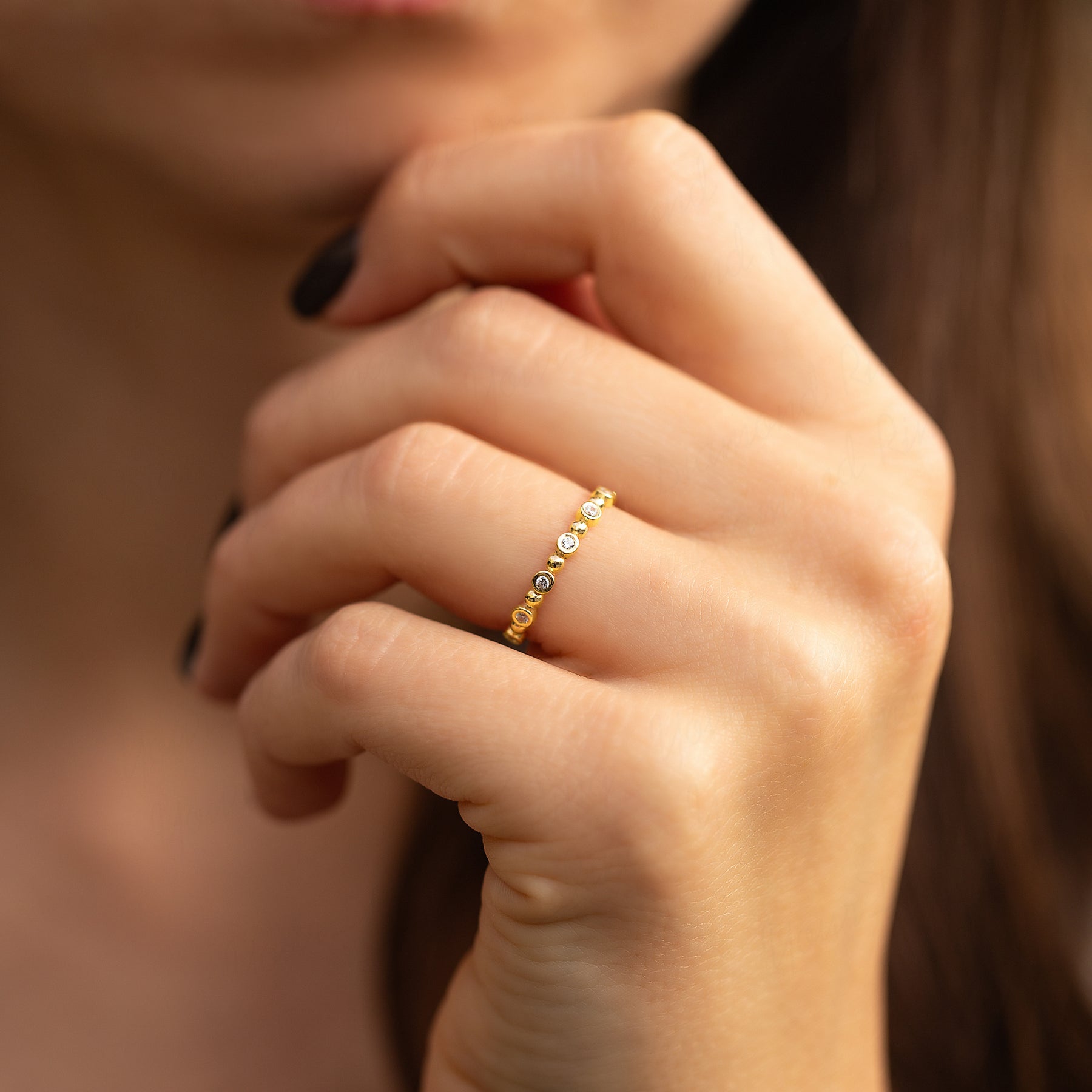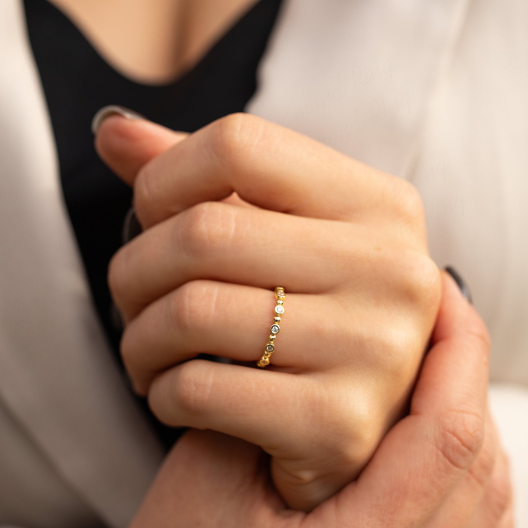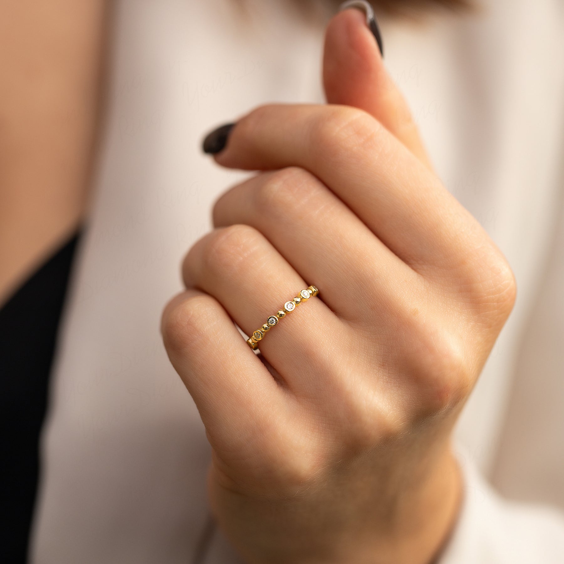 Unique minimalist 14k yellow gold bezel set diamond wedding band or stacking ring for her